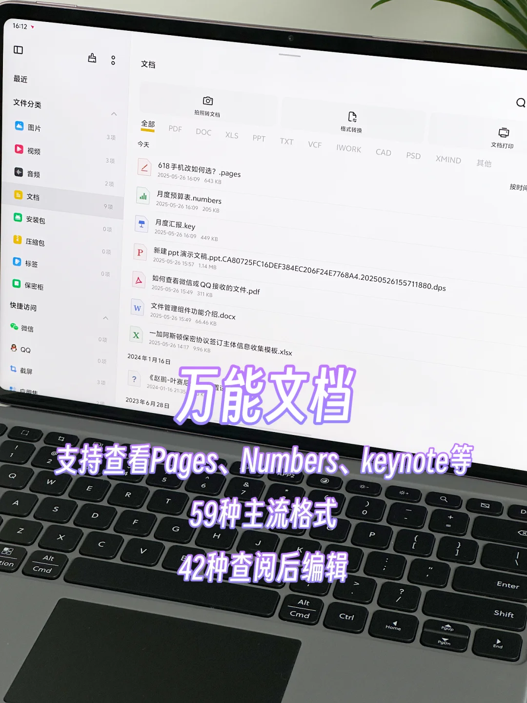 另外,它的万能文档功能也很牛,支持59种主流文档格式查看,还能对42种文件进行查阅后编辑,像有时候收到苹果系统同时发的Pages文档,还要找电脑打开才能看。现在直接在平板上就能查看编辑,方便多了,在平板上做好的Word、表格发到电脑上格式也不会错乱,这一点真的大大好评。
