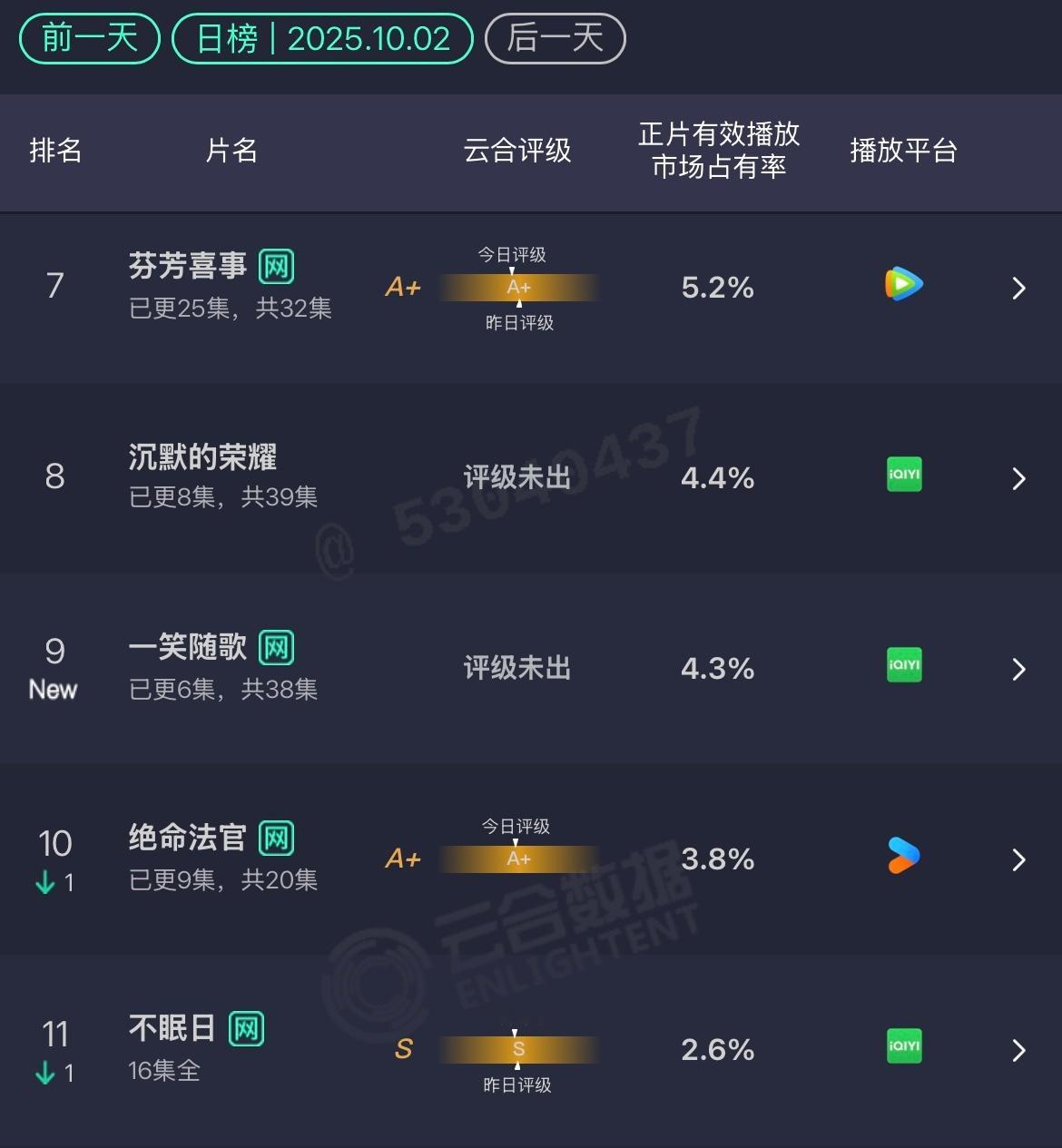 10.2云合许我耀眼:37.9%一笑随歌:4.3%首日12点开播,不能说好