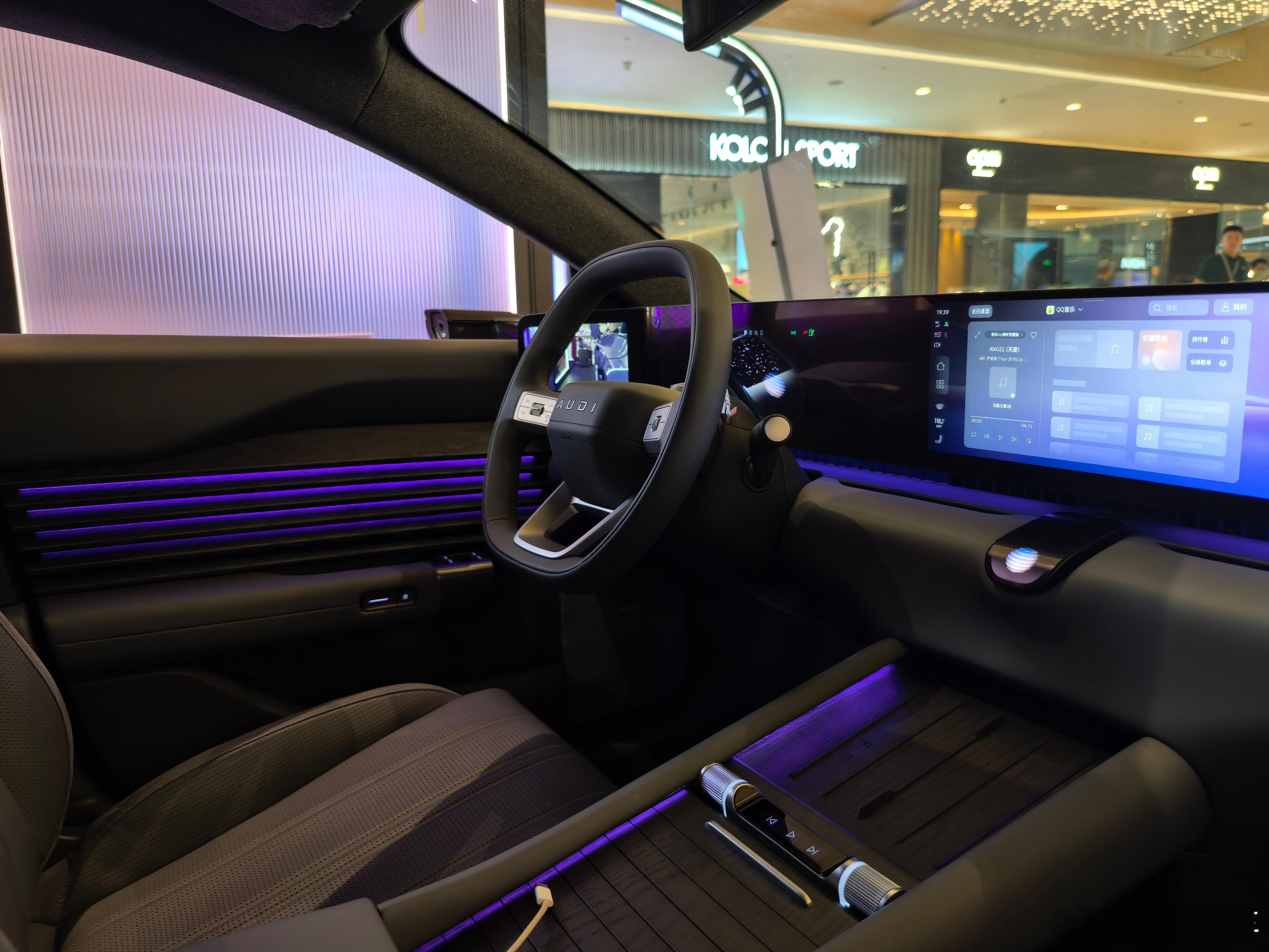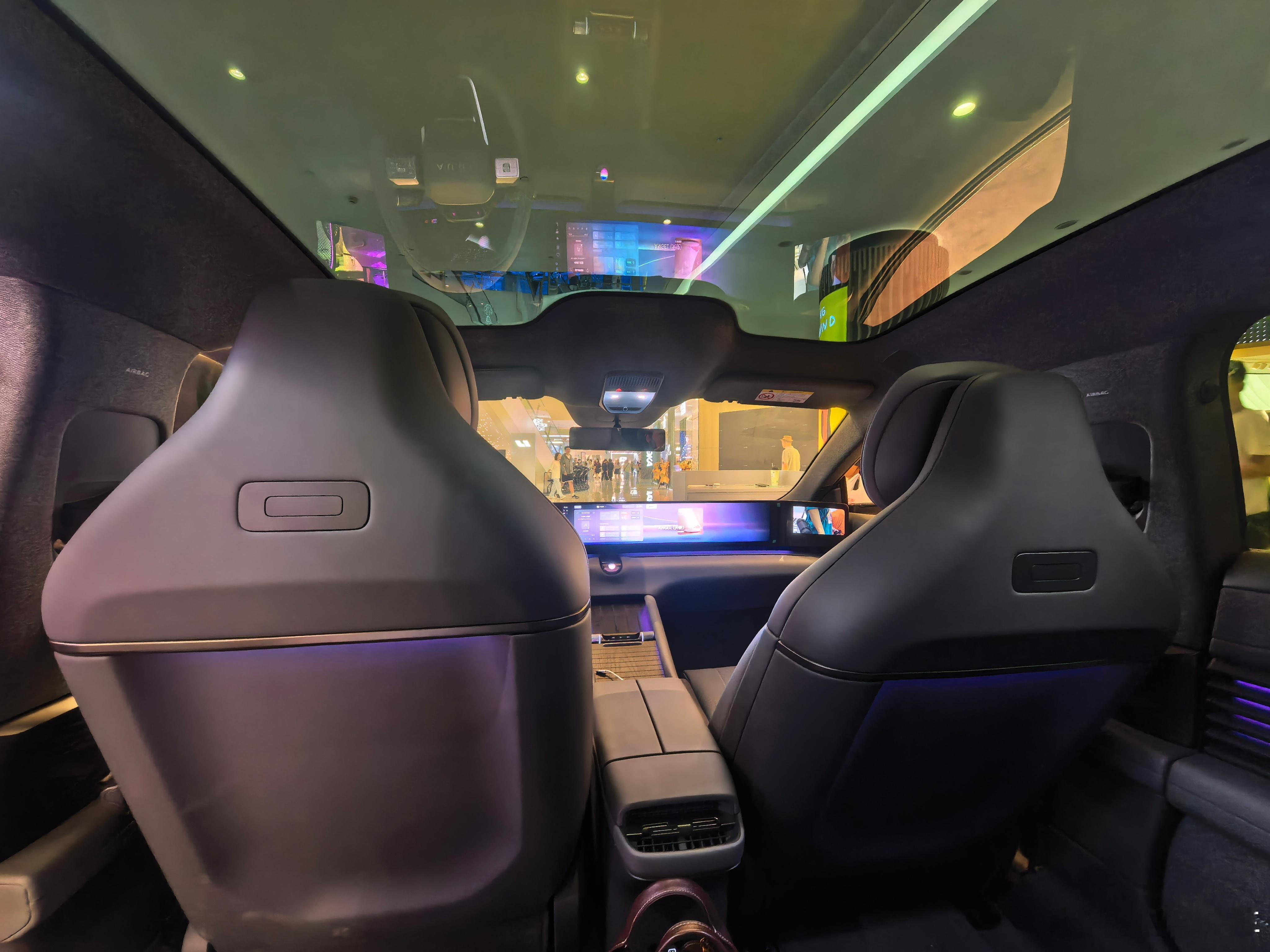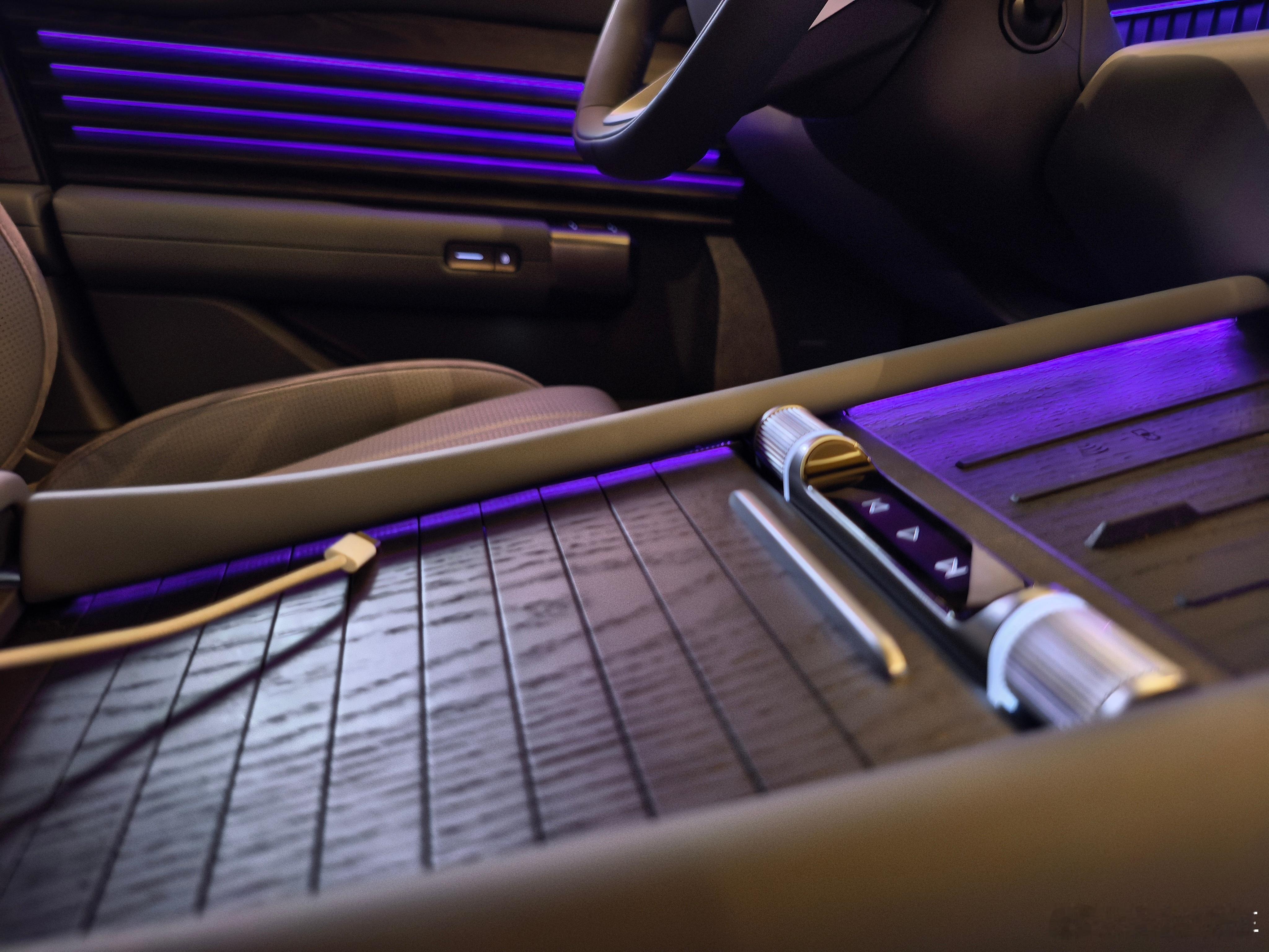 这个内饰是碳灰色的,配上紫色的氛围灯很有质感,而且整个车内你想到想不到的很多地方都有氛围灯,比如门板上,屏幕下方,头枕位置,中央扶手,甚至座椅靠背上,不得不说传统豪华品牌对氛围感的诠释还是很到位的!