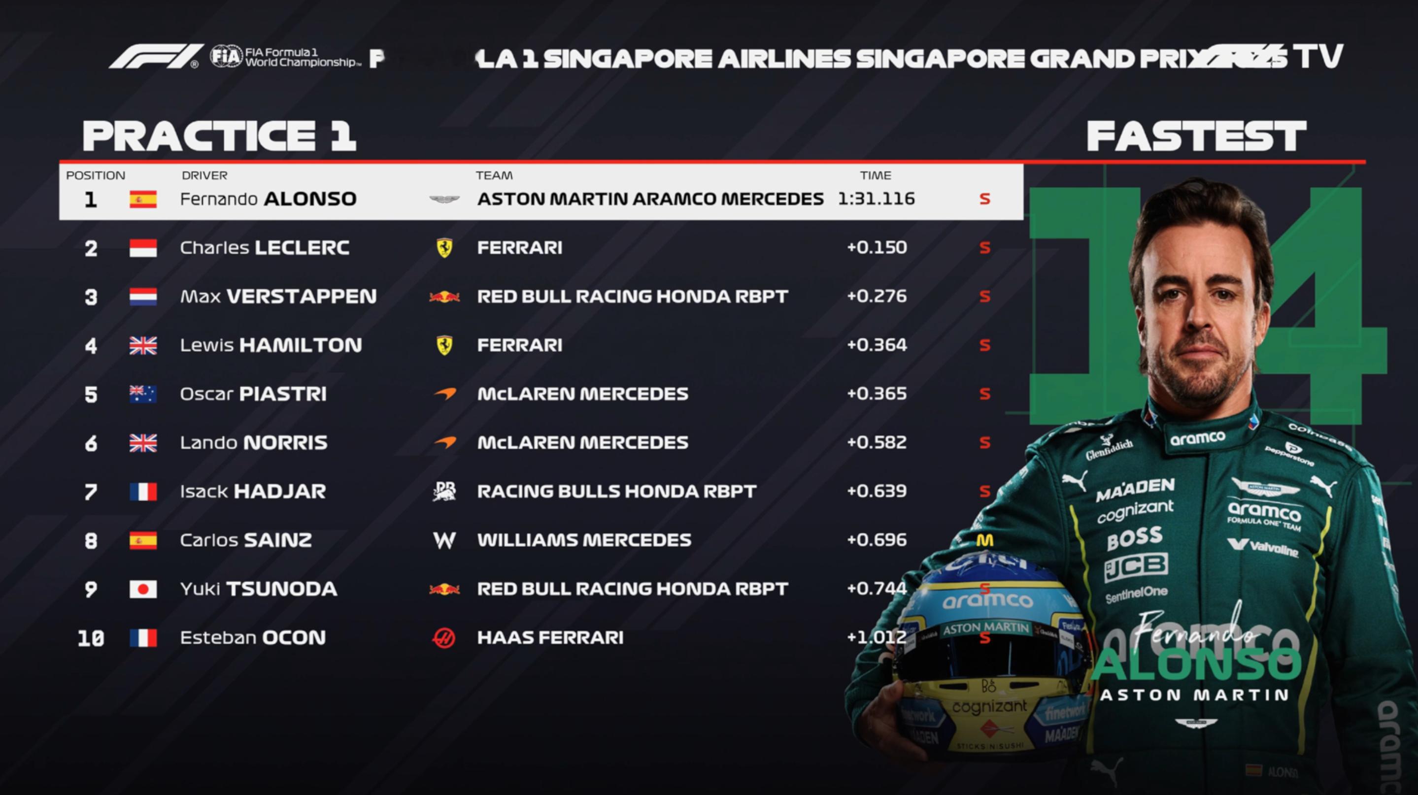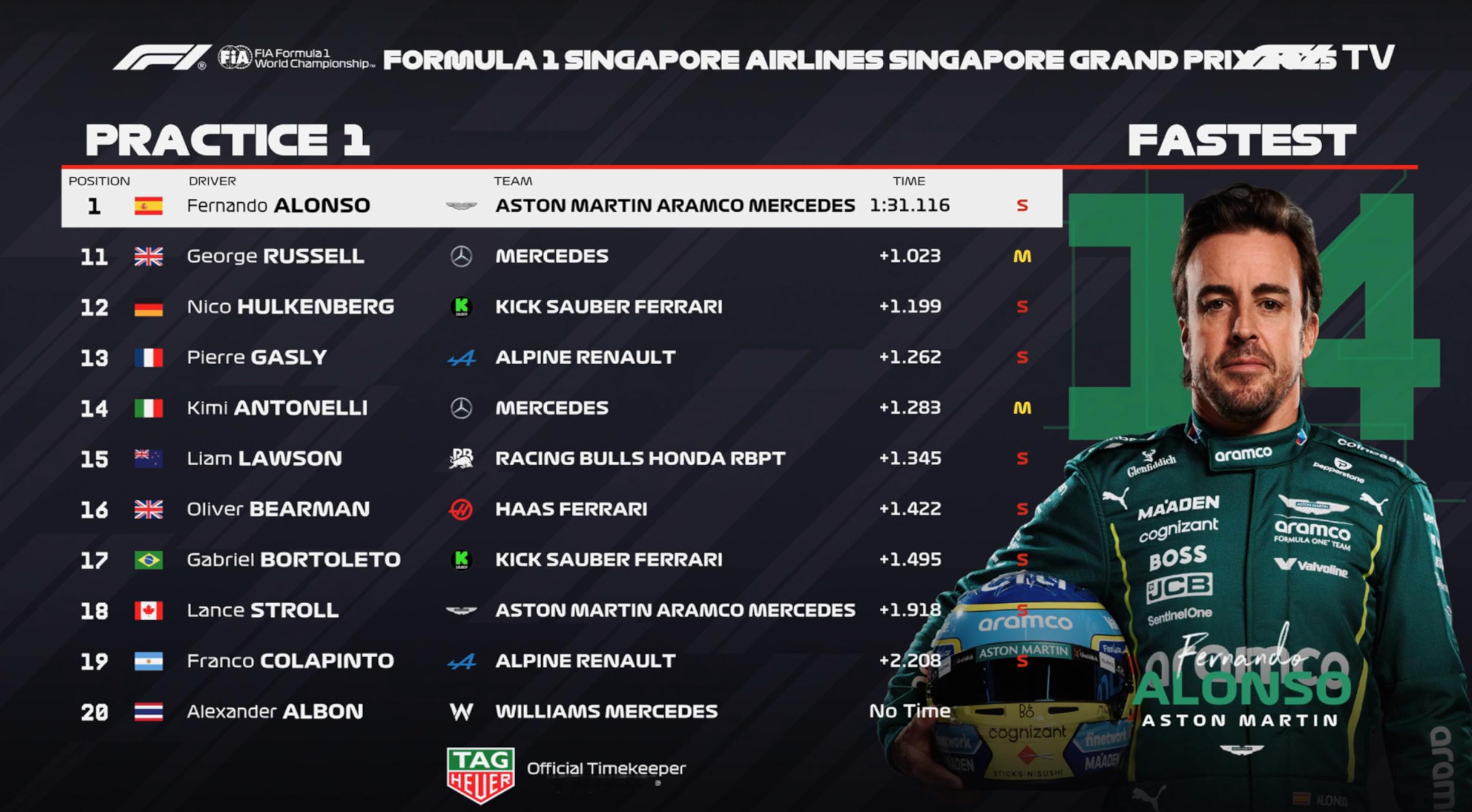 新加坡FP1成绩:阿隆索最快,乐扣P2,维斯塔潘P3