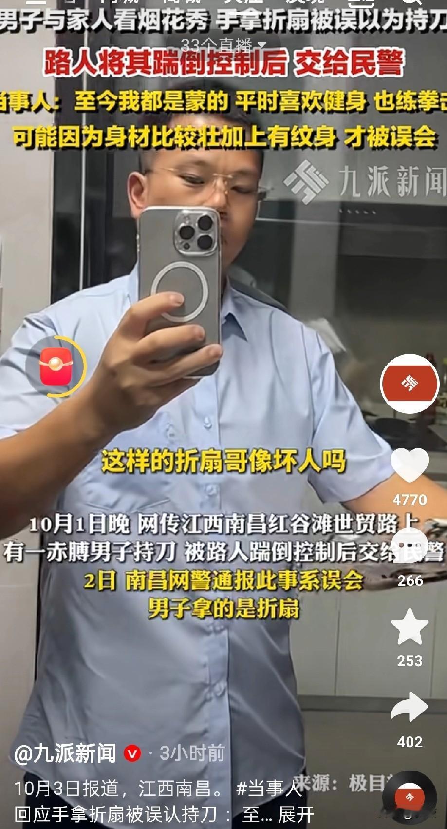 男子去看烟花秀居然被人当场踹倒交给警察?10月1日江西南昌,李先生和家人去看烟花秀表演,因为觉得热就把上衣脱了,还买了一把折扇,烟花表演结束后,他发现外甥不见了,于是大喊外甥名字,谁知突然有人夺走了他的扇子,还踹了他屁股一脚,倒地后很快被控制起来交给了民警。 民警将他带到派出所,详细询问之后才发现是误会,原来是因为李先生平时喜欢健身,身材比较好,身上还有纹身,再加上拿着折扇,路人看错以为是持刀,解释清楚后就把李先生放了。 李先生表示,我到现在还是没懵的,白白得了一顿打,我也是醉了。 这可真是无妄之灾,看表演的好心情都荡然无存了吧!不过人心里的成见真是一座大山,不能因为长相身材纹身而把别人当成坏人吧。