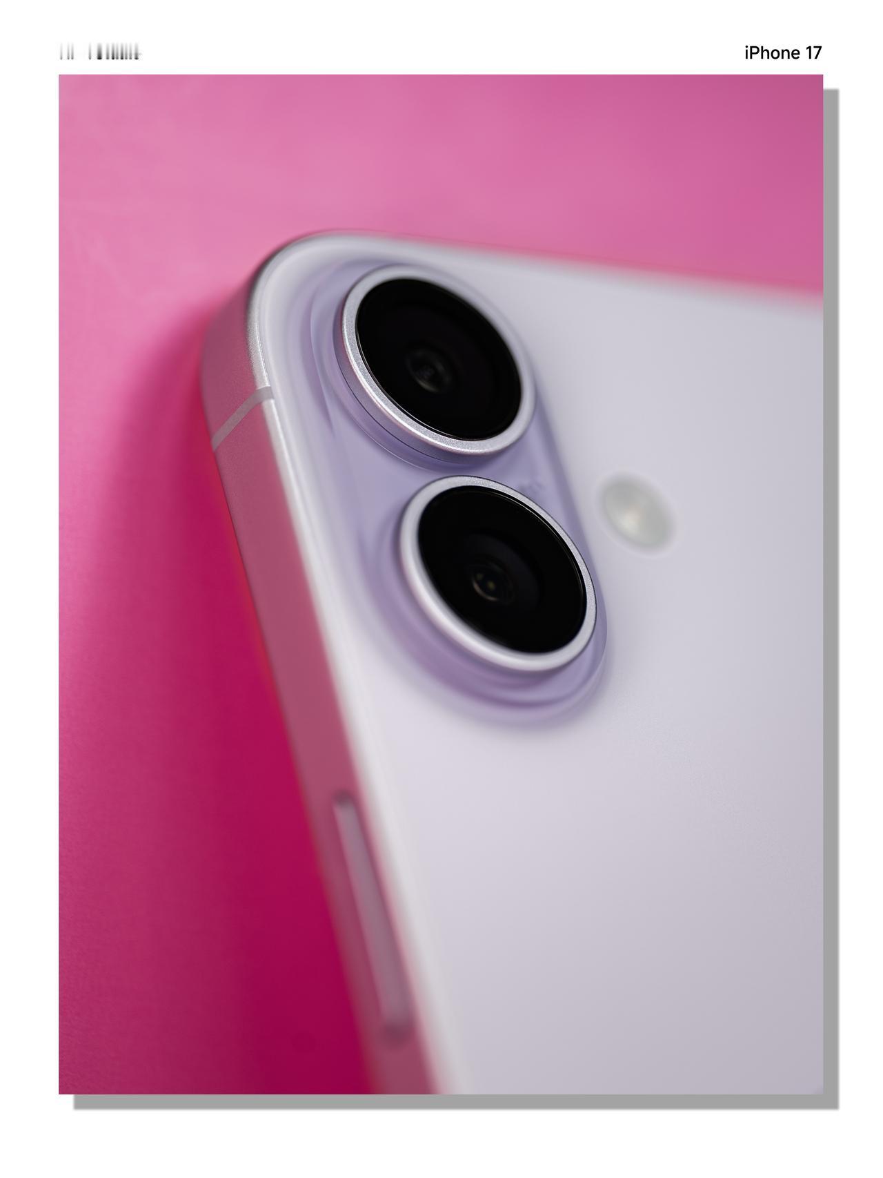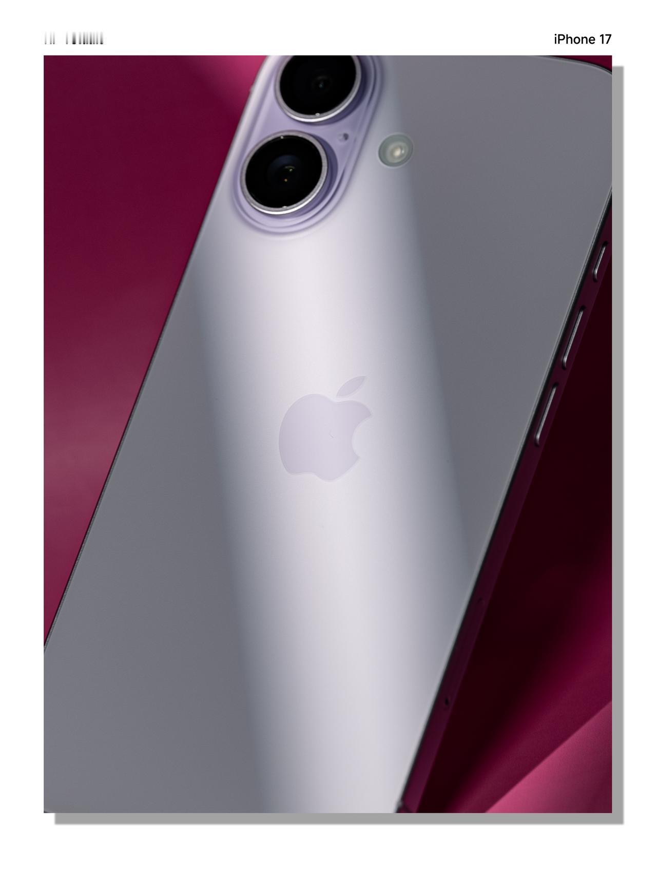 HYK图赏|iPhone 17标准版 薰衣草配色,在阳光下是一种淡淡的紫色。整体外观设计与上代没太大改变,屏幕尺寸由6.1英寸升级到6.3英寸、中框上下的弧度要更大一些,厚度增加到7.95mm铝合金边框。机身背面是磨砂玻璃+两层凸起的镜头Deco。最重要的是有了120Hz高刷+256GB起步内存,大伙觉得这次iPhone 17的牙膏挤爆了吗?