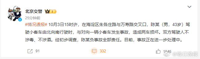 【#北京交警通报陈震发生车祸#】10月4日,发布通报:10月3日15时许,在海淀区朱各庄路与万寿路交叉口,陈某(男,43岁)驾驶小客车由北向南行驶时,与对向一辆小客车发生事故,造成两车损坏。双方驾驶人不涉毒、不涉酒。经初步调查,陈某负事故全部责任。目前,事故正在进一步处理中。#陈震妻子回应#