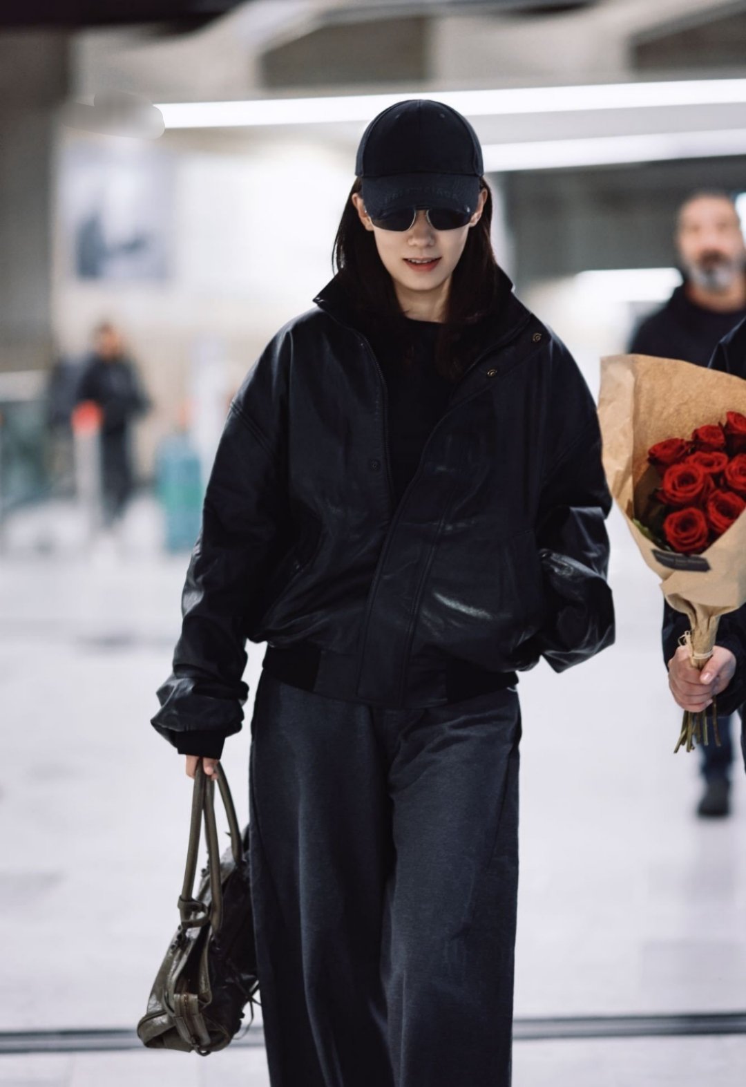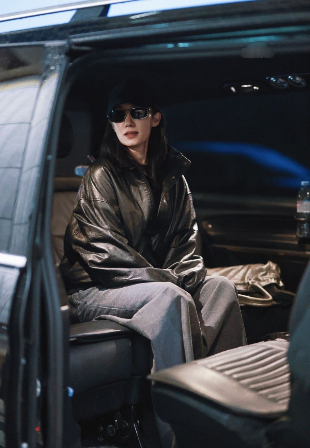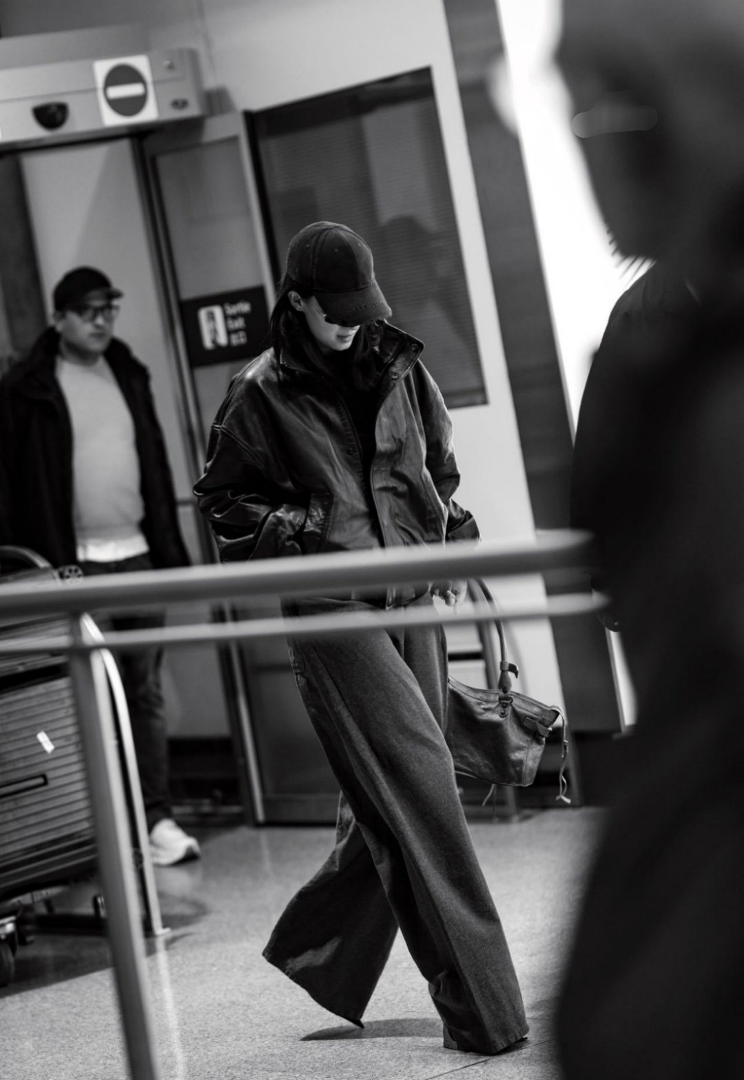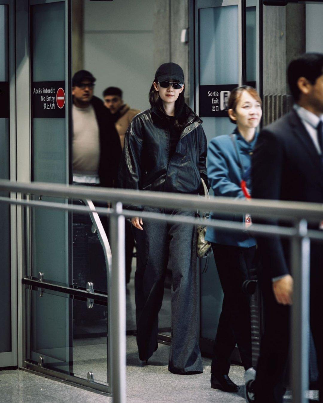 张小斐巴黎到达图 皮衣尖头鞋气质和气场都好绝超高级!!好飒好有魅力的张小斐[打call]