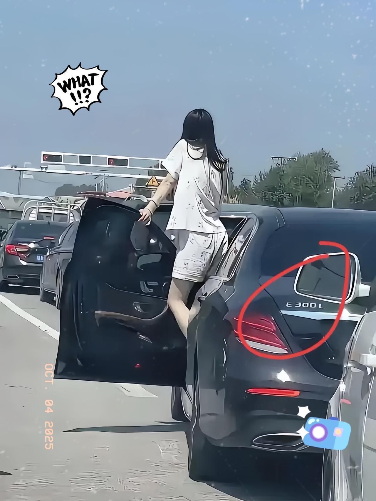 堵车路上瞥到一幕特有意思 我看到一个穿睡衣的女生从奔驰E300L上下来透气,满身