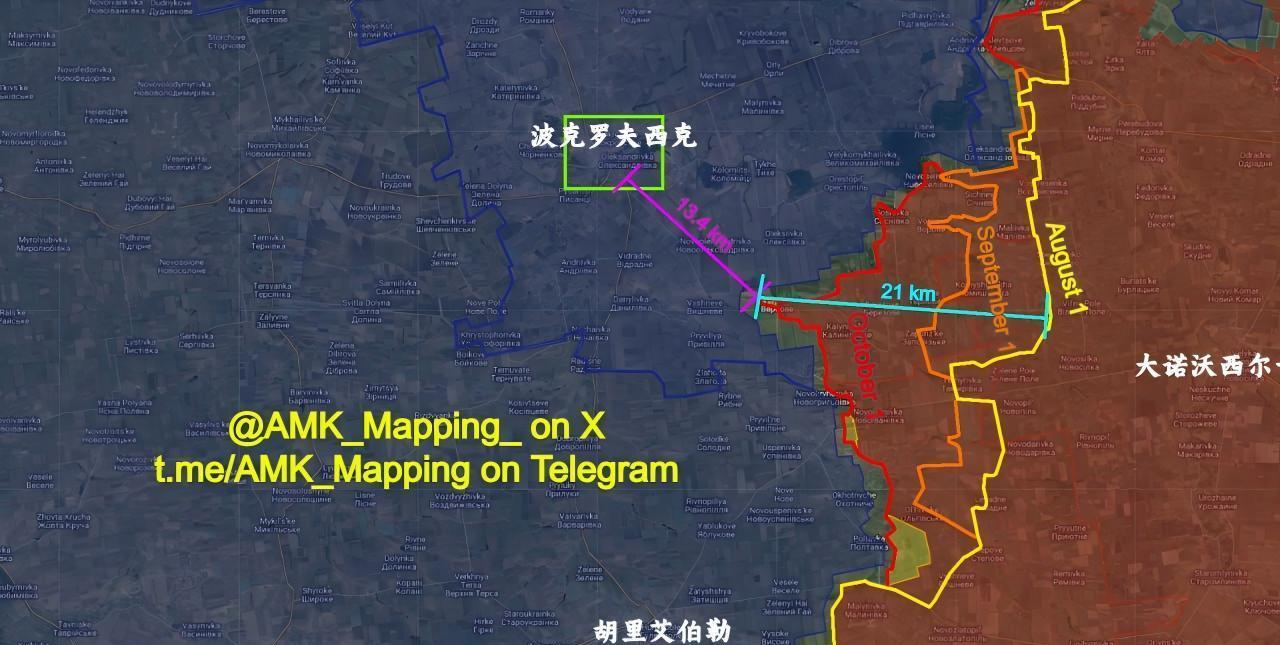 俄军东部集群两个月已经向西推进了21km,黄线是8月1日接触线,橙线是9月1日接触线,红线是10月1日接触线,目前距离重要的乌军后勤枢纽波克罗夫西克只有13.4km了。随后如果有一路转向西南库班方向攻击,那么俄军可以南北对进拿下扎波罗热剩下的一大块。