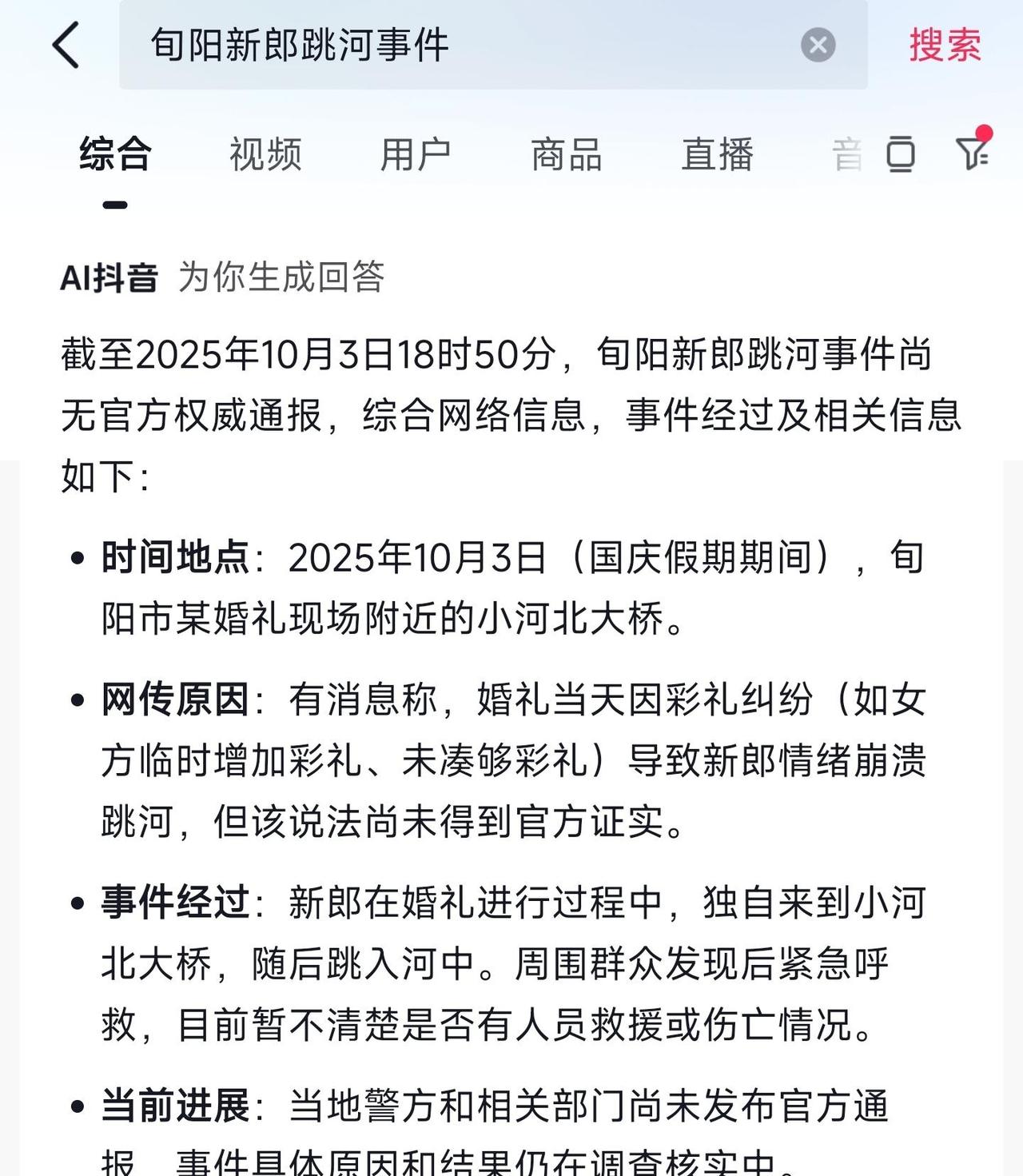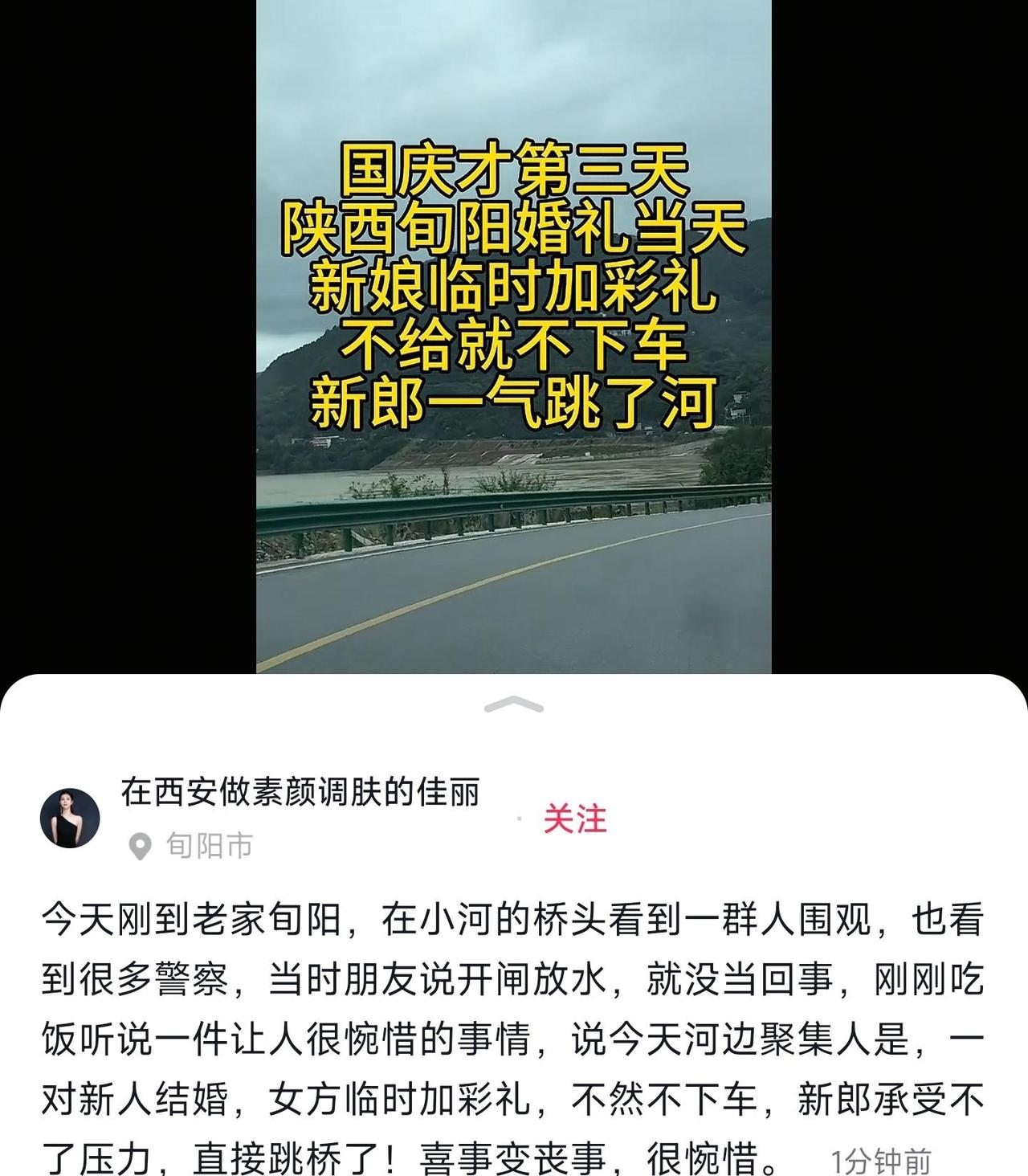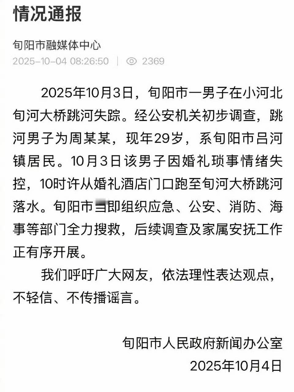 如何看待2025年10月3日陕西安康旬阳一男子婚礼当天跳河自杀? -