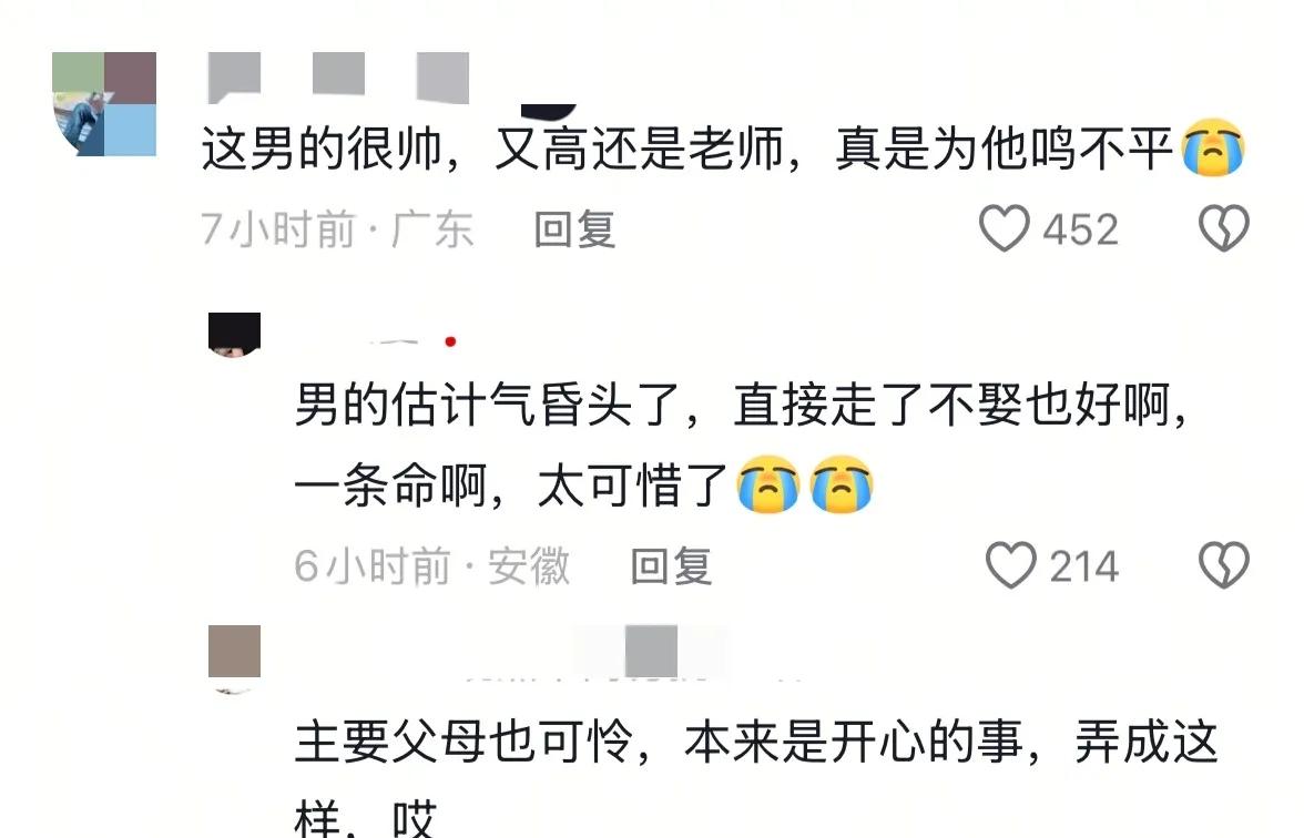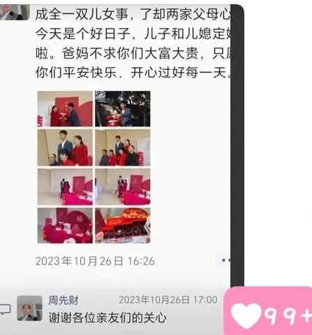 这是跳河新郎的父亲曾发过的朋友圈,那天是2023年10月26日。彼时,是他儿子儿媳的订婚仪式,他满心欢喜的发布了一条祝福的动态。 老两口是陕西旬阳icon面朝黄土背朝天的农民,每天早出晚归,辛苦了大半生托举儿子,最终让他在西安icon有了体面的工作。 谁能想到,短短一年后,2025年10月3日的婚礼当天,他们29岁的儿子周某某会从旬河大桥纵身跃下。那时距离婚礼开始只剩一个小时,酒店已准备就绪,亲友正陆续到场。 河水又浑又急,水深五六米。目击者看着新郎跳下去,冒了下头,就被汹涌的河水冲出几十米远,消失无踪。救援队伍火速赶到,在浑浊的水中反复搜寻,但截至10月4日,人依然没找到。 网络瞬间炸开了锅。传言像野火蔓延,说男方家已支付20万彩礼,婚礼当天新娘家临时索要2万元“下车费”,成了压垮骆驼的最后一根稻草。更有消息说,新郎母亲得知儿子跳河后情绪崩溃,也从下游跳下,幸被及时救起送医。 但官方给出了截然不同的说法。旬阳市官方通报强调,周某某是因“婚礼琐事”情绪失控。相关部门负责人明确表示:“可以明确说跟彩礼没有关系”。真相究竟如何,或许只有湍急的旬河水知道。 这场悲剧撕开了一个沉重的社会伤口。它让很多人看到了自己被婚俗经济重压的影子:一个农村家庭,父母土里刨食,倾尽所有把孩子供出城市。儿子看似有了稳定工作,在西安买了房,成了家里的“顶梁柱”,却依然在婚姻门槛前摇摇欲坠。 婚礼本该是幸福的起点,却成了压垮生命的瞬间。当繁复的习俗变成冰冷的交易,当情感联结被明码标价,婚姻的本质早已迷失。 我们惋惜一个年轻生命的决绝,更心疼那对老父母。他们曾用汗水浇灌儿子的未来,最终却在河边等待永无回应的搜寻结果。农民家庭的坚韧与脆弱,在这一刻无比刺眼。 各位读者你们怎么看?欢迎在评论区讨论。