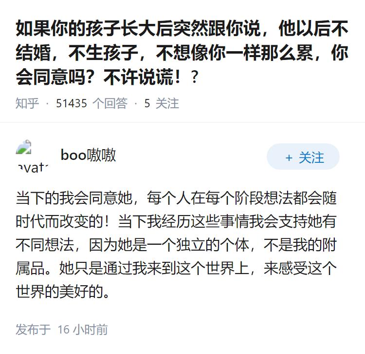如果你的孩子长大后突然跟你说,他以后不结婚,不生孩子,不想像你一样那么累,你会同意吗?不许说谎!?