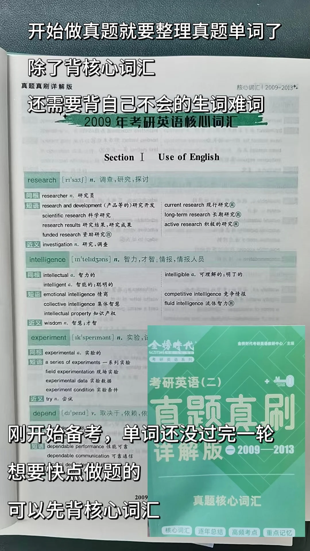 真题单词包括重点词汇和自己不会的生词难词,重点词汇就是试题精讲中的词汇释义所展示的单词