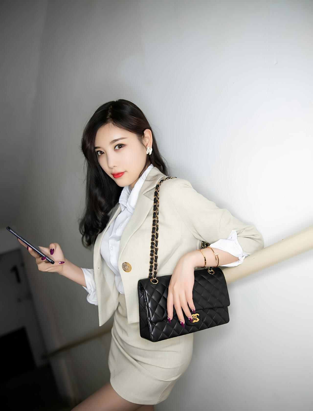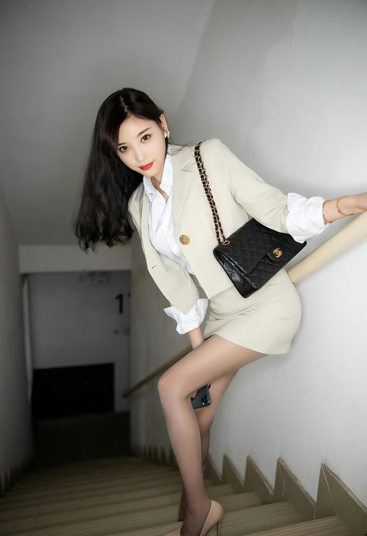 楼梯间的时尚叙事:包臀裙装+丝袜,杨晨晨演绎通勤风高级感