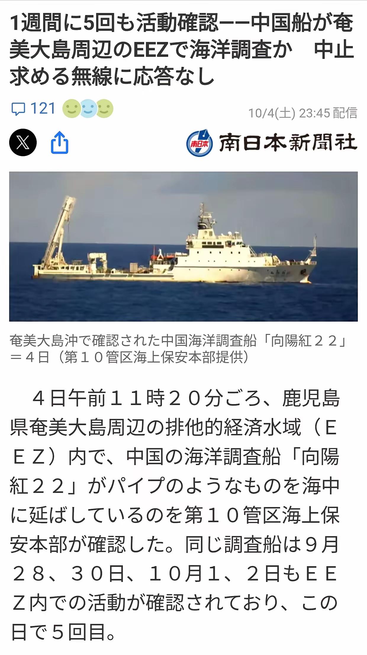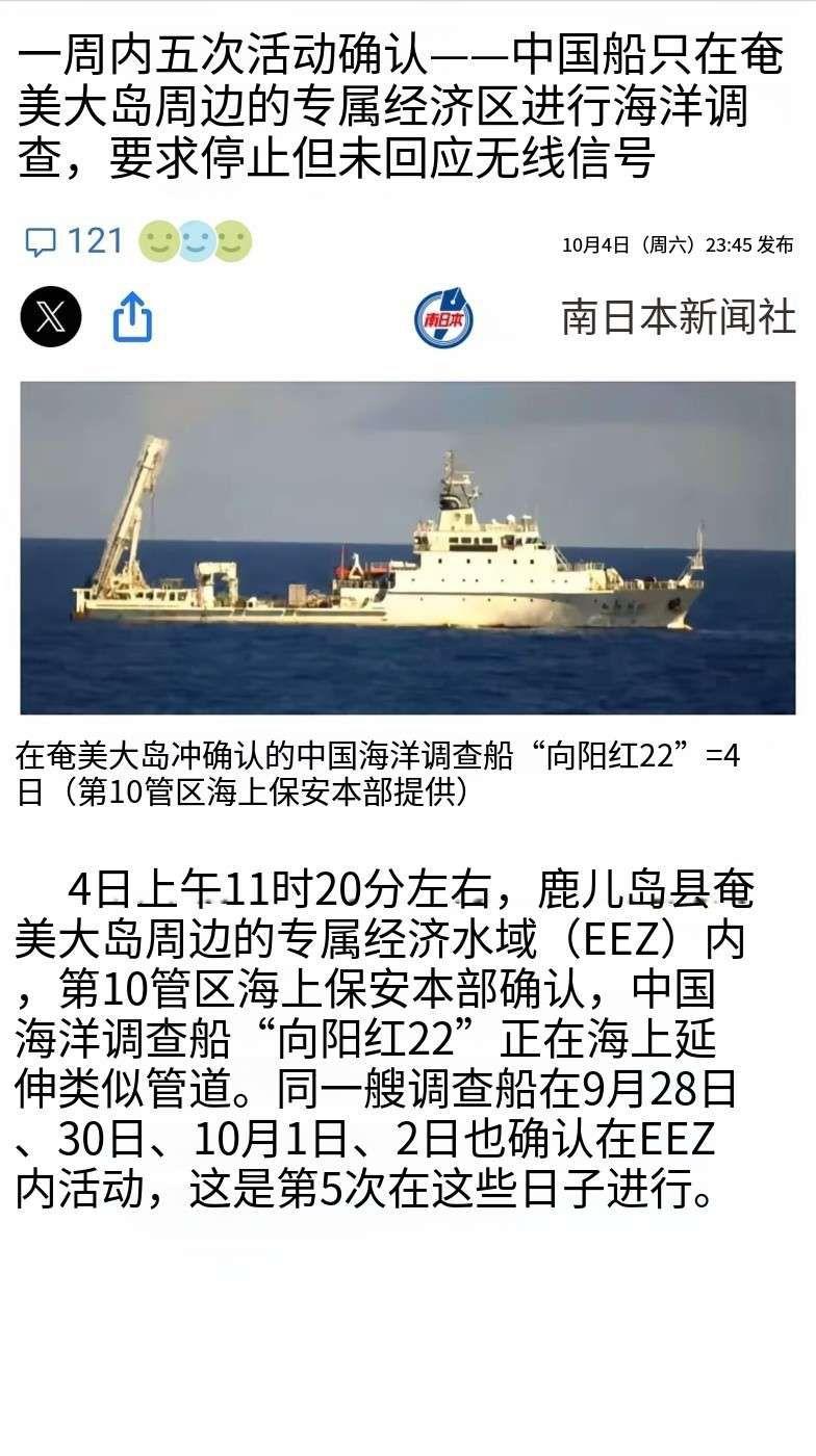 日本《南日本新闻》10月4日晚报道,4日上午11时,日本第10区保安本部确认,中国海洋科考船“向阳红22”号出现在鹿儿岛奄美大岛周边日本所谓“专属经济区(EEZ)”内,向海中投放类似电缆的物体。 同一艘船曾在9月28日、30日、10月1日和2日,也在同一“专属经济区”活动过。 报道称,日本海上保安厅用无线电要求停止“考察”行动,但没有得到想要的回应,当然考察行动也没停止。 日本别紧张,就是溜达溜达,听说自民党在选当日本首相的总裁,就过来看看是哪个犊子玩儿被选上了,你们选你们的,继续。 不予回应就对啦。正在忙着呢,哪有时间搭理你。再说我干什么关你什么事,你问个球?还要求停止,你算哪棵葱?
