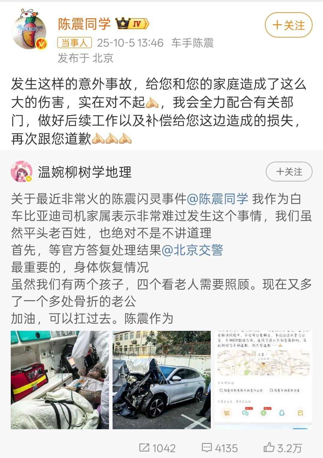 陈震再发文道歉作旁观者真的希望注意安全,开车一定要安全第一!今天早上还看到一新能源车刮蹭到一骑电动车的女孩,司机及旁边的人过来帮忙扶起女孩,女孩摸着屁股,应该是摔疼了。扶车的试着发动电动车,基本正常能开。