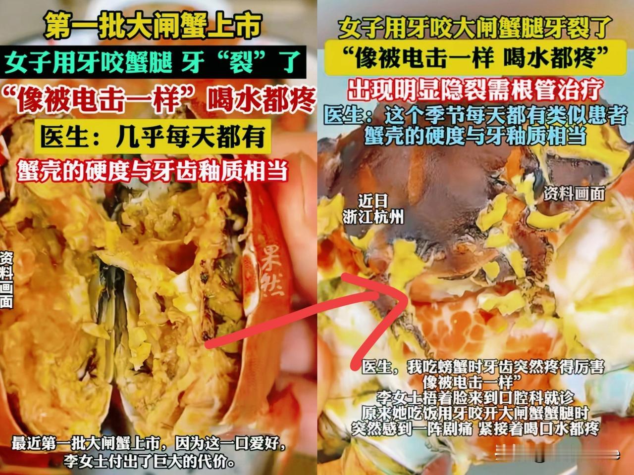 浙江一名女子吃大闸蟹时,突然感觉牙齿剧痛,就像被电击一样,于是赶紧去往医院检查,结果发现她的牙齿出现了隐裂,就是咬大闸蟹太用力给闹的。 医生说啊,蟹壳和牙齿的釉质硬度差不多,所以每年大闸蟹季,都有好些像她这样的患者,最后都得做根管治疗。网友们知道这事儿后,都觉得这女的也太倒霉了,就吃个大闸蟹,牙居然就裂了。 其实我们很多人都觉得自己牙齿挺结实,吃硬壳食物不在意。但你看,就这么一不小心,问题就来了。牙齿对咱们多重要啊,要是不好好保护,以后吃东西都得受影响。 大家平常吃带硬壳食物,有没有什么避免伤牙的小窍门?
