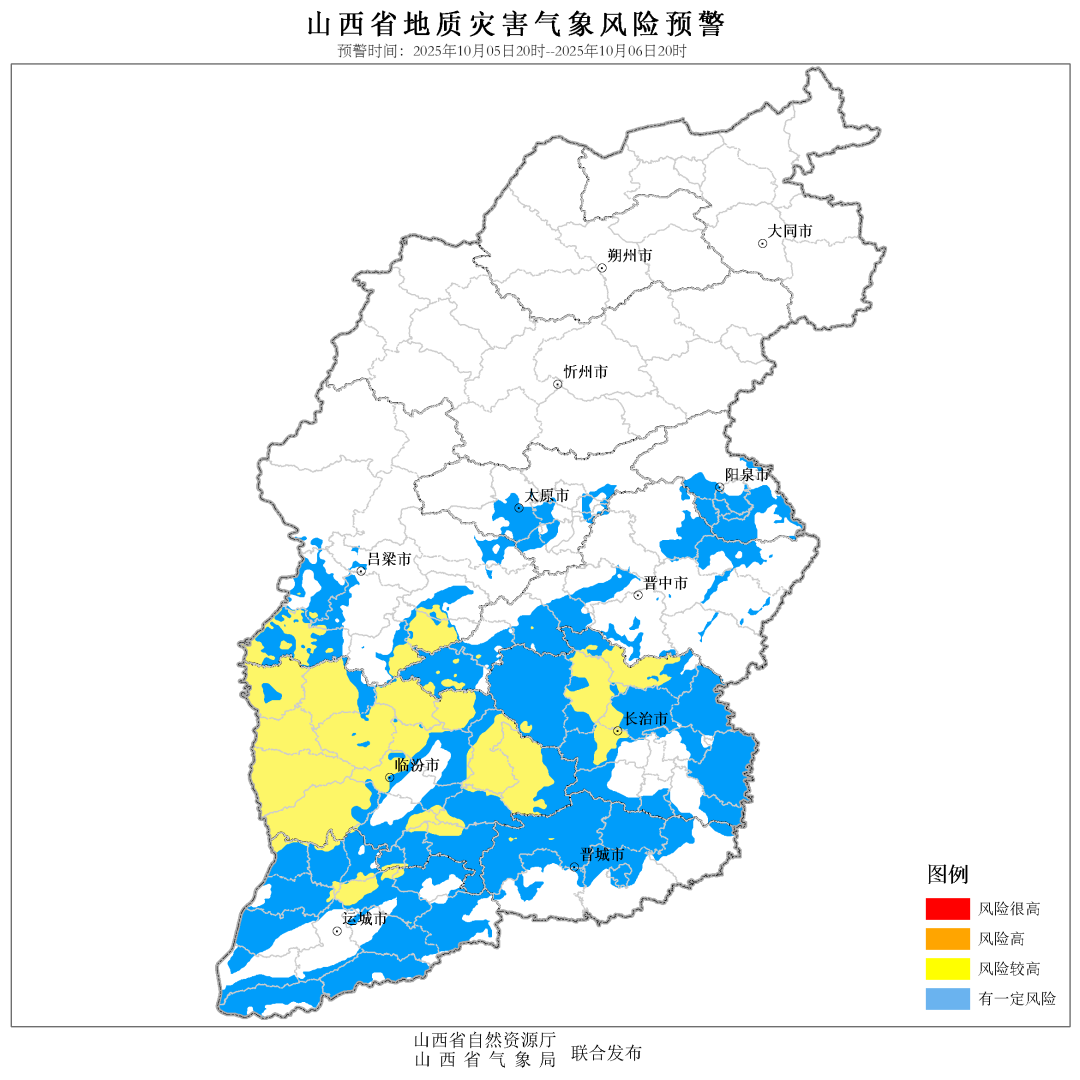 省自然资源厅、省气象局联合发布地质灾害气象风险预警:2025年10月05日20时至10月06日20时,预计山西省长治市、晋城市、晋中市、运城市、临汾市、吕梁市等6个市39个县(市、区)地质灾害发生风险较高(黄色预警);
