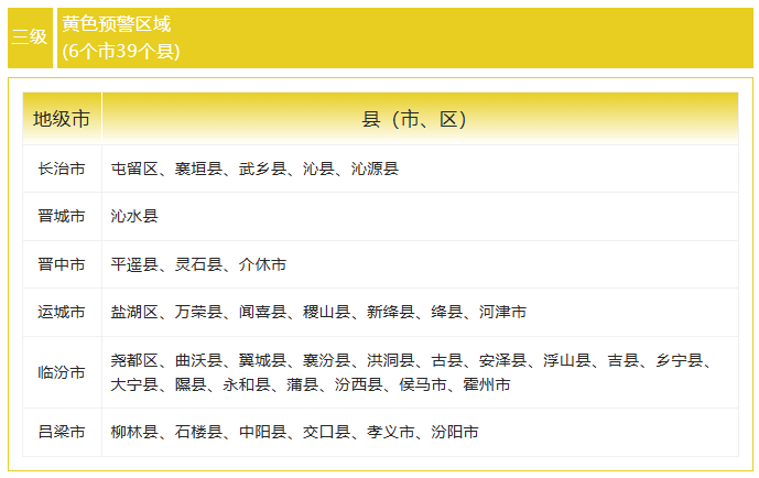 太原市、阳泉市、长治市、晋城市、晋中市、运城市、吕梁市等7个市46个县(市、区)地质灾害发生有一定风险(蓝色预警)。