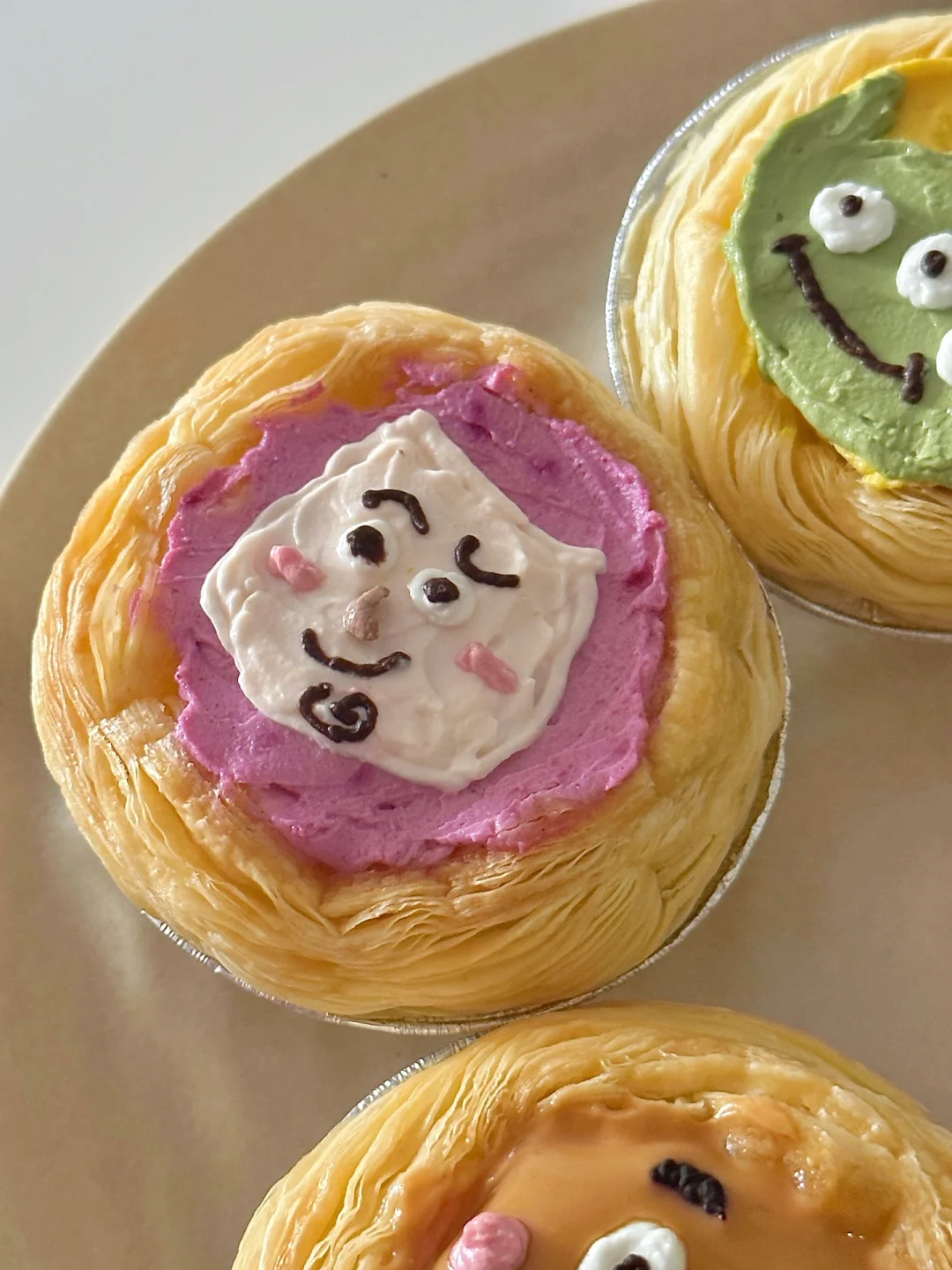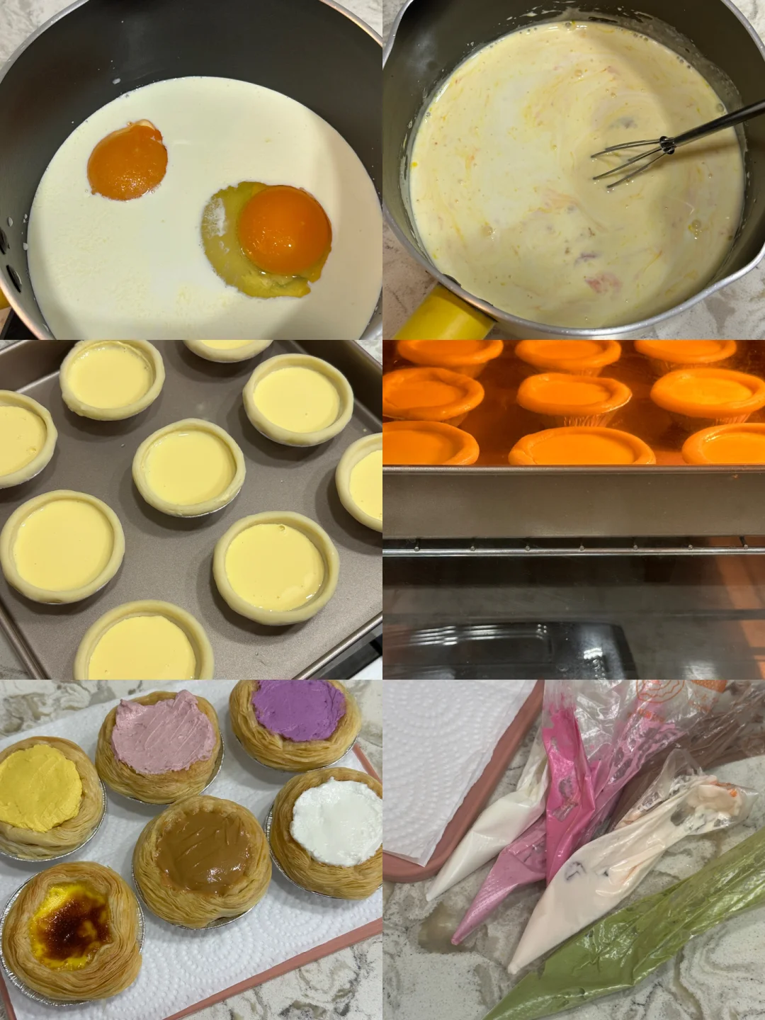 ①调好色的希腊酸奶装入裱花袋,在蛋挞上挤出圆形,再用塑料薄刮片刮平