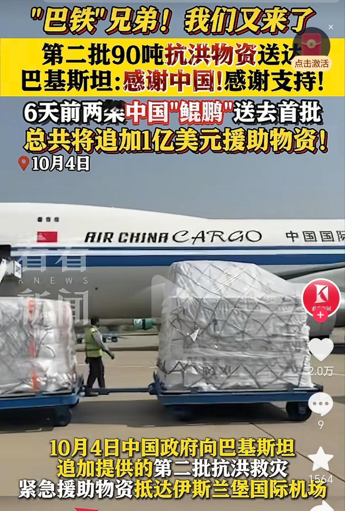 中国再次伸出援手 第二批00000抗洪救灾物资 紧急启运巴基斯坦 中国再次慷慨解囊,第二批抗洪救灾物资正飞往巴基斯坦!帐篷、毛毯等急需物品将为灾民带来温暖。这次援助真是及时雨啊!想象一下,那些在寒风中颤抖的巴基斯坦朋友们,突然收到了来自中国的温暖包裹,心里该有多暖和! 这批物资包括帐篷、毛毯、睡袋和救生衣等,都是灾区人民最迫切需要的东西。这些救命物资由中国国际货运航空公司的商业包机运往伊斯兰堡,确保能迅速送到灾民手中。而首批物资已经通过空军运-20顺利抵达,剩下的物资也将通过海运陆续抵达卡拉奇港。 中国的这份爱心不仅温暖了巴基斯坦人民的心,也展示了两国之间的深厚友谊。在这个关键时刻,中国的援助无疑给了巴基斯坦人民极大的支持和希望。大家怎么看?这样的国际援助是不是更能体现一个国家的责任与担当?