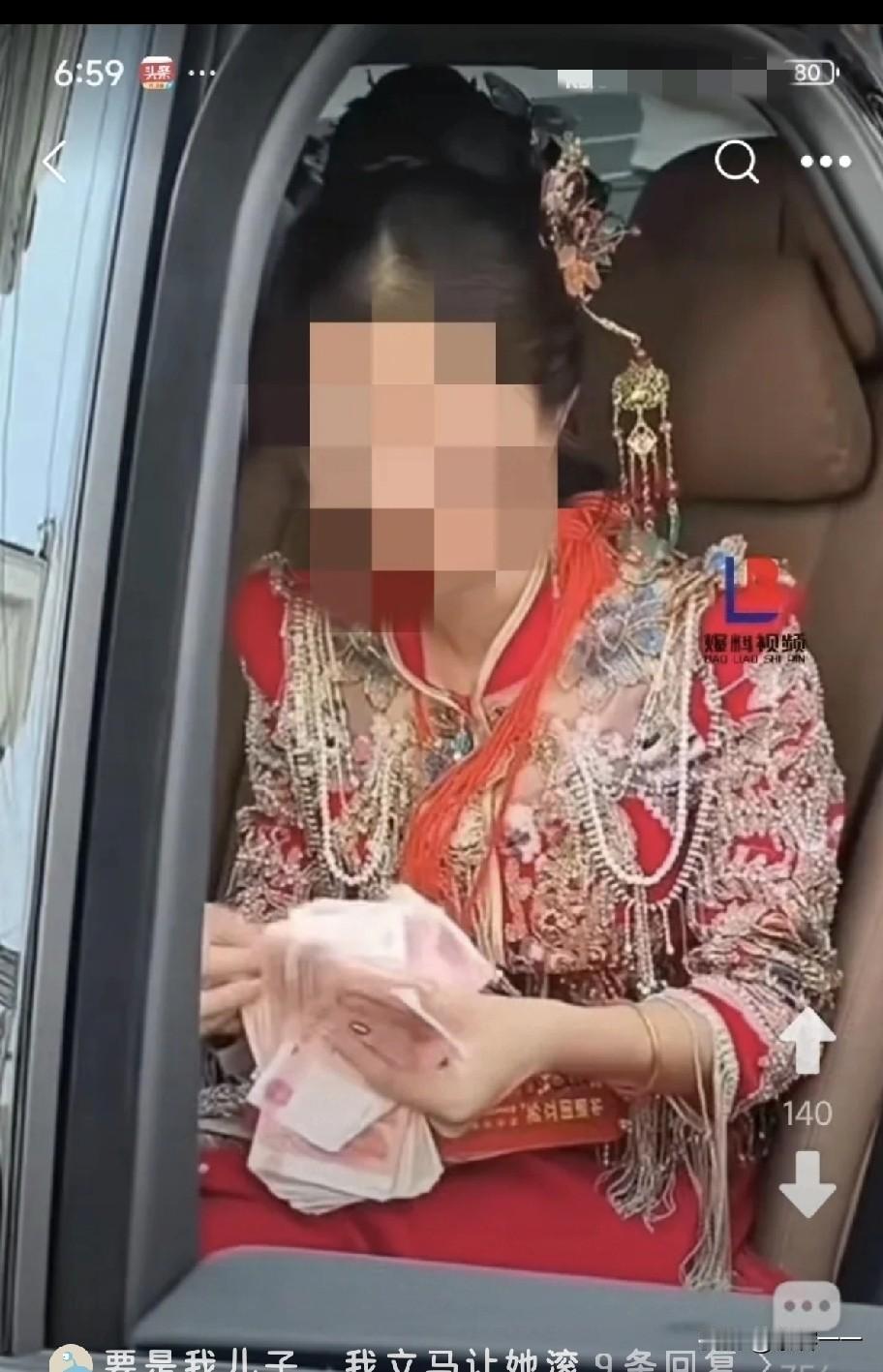 "新娘的这个动作真丑[尬笑]"!这是发生婚礼当天的一件事,一屋的人都在等着抱新娘子进门,结果新娘子却稳稳当当的坐在车内认真地一张一张数着下车费! 婚车开到新郎家后,新娘坐在车上没有马上下车,她等着男方给她下车礼! 男方很爽快的给了新娘一个大红包,准备牵着新娘迎着吉时下车。 可是让大家傻眼的是,新娘没有下车,而是如老僧入定般稳坐在车内,一张一张的认认真真地数着钞票,看那架势,生怕少了一张钱。 这一幕也引发了网友的热议。 有的网友说:看见满头白发的新郎母亲我感到十分辛酸。这就是在看自己给自己定的价位,到底对不对了,少一分钱都不卖! 有的网友说:你数的不是钱,数的是人心啊!三岁小孩都知道不能当着别人的面拆红包,你这是嫁人不是卖人! 有的网友说:把婚姻做成了生意,这是十分可悲的事情。没有看到新娘对婚礼的期盼,只看到她对钱的执着!这婚哪怕结成了对新郎的家庭来说也是可悲的。结婚不是两个人一起同舟共济吗? 有的网友说:这样的女人娶回家干嘛呢?要钱不要命的主,白给我当儿媳妇我都不要,要是我一把钱抢回来,取消婚礼,把彩礼的钱给我退回来。 ………… 【我的点评】: 这年头,很多女人把婚姻当成了一场交易,只看眼前利益,不愿意共同奋斗了!结个婚,除了彩礼,还有各种名堂的礼…… 既然是下车礼,一个“礼”字,就代表着心意,图个吉利罢了,真的没有必要数那么认真! 况且新娘在婚车里数钱,不但丢了自己和娘家的脸面。也让婆家人在亲戚面前脸上无光! 这数的不是钱,数的是人心,数的是信任! 如果少一张,难道还真不下车了吗? 结婚讲究一个吉时,可你这数钱的动作在告诉大家:婚礼可以延迟,爱情也不值一文,但下车费可是一分都不能少! 大家说娶这样的女人做老婆合适吗?
