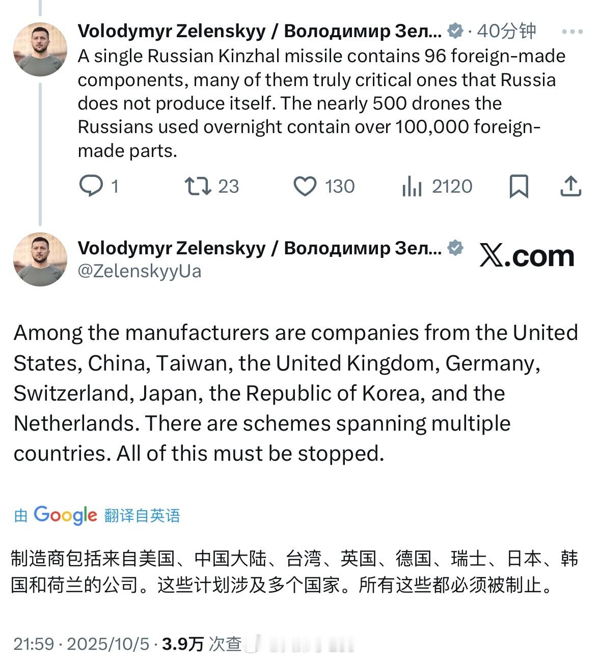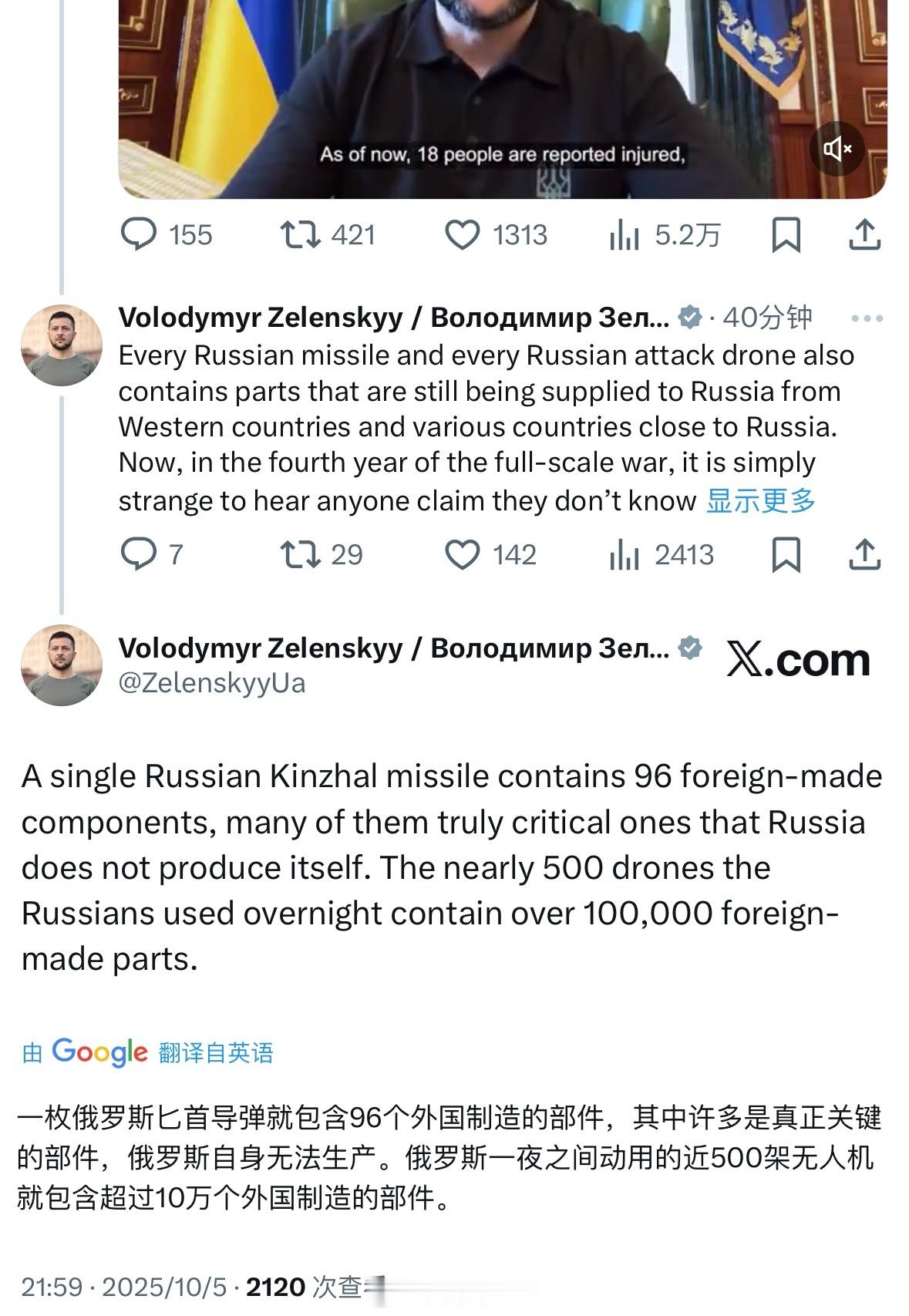 泽连斯基怒斥全世界,表示一枚俄罗斯导弹的零部件来自全球96个国家