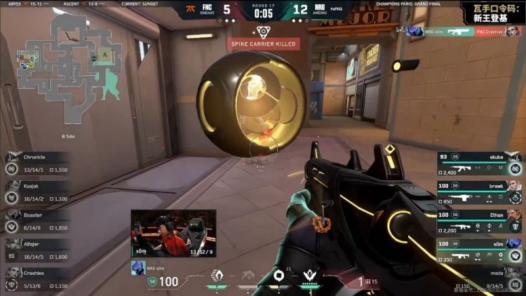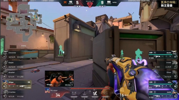 第15局来到长枪,FNC带包慢打中路,NRG两人中路前顶,双方交换技能拉开,FNC带包转A,双方3换3,mada击杀Boaster,Alfajer包点1v3被缴,FNC5-10NRG。