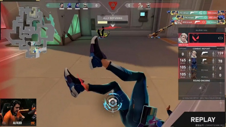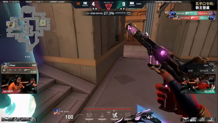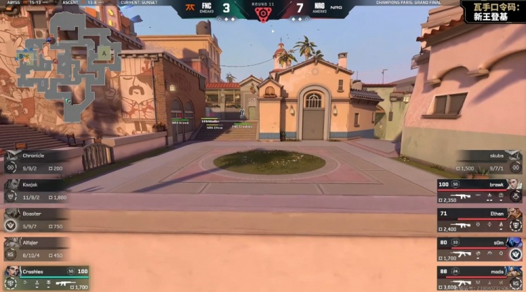 第12局NRG控球打A,mada先送首杀,NRG在A下包,FNC五人回防夹后巷,Alfajer霓虹三杀收尾但没时间拆包,FNC3-9NRG。