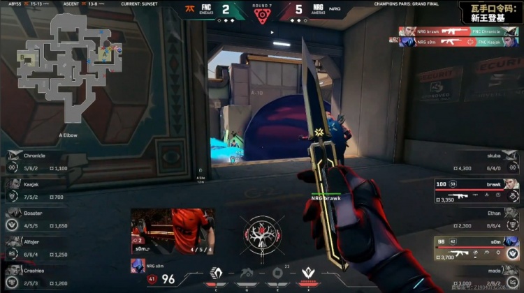 第7局NRG继续来A大打A,mada先换掉Crashies,NRG放缓节奏,FNC三人转B,NRG慢摸A点下包,FNC四人回防,brawk击杀Boaster,残局2v2,brawk联手s0m双杀Chronicle与Kaajak,FNC2-5NRG。