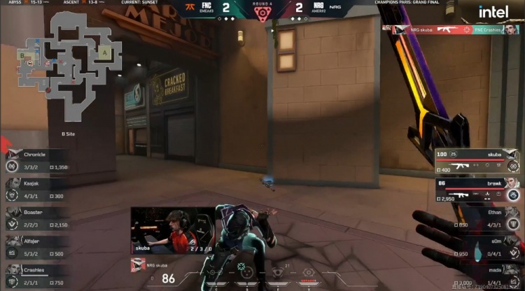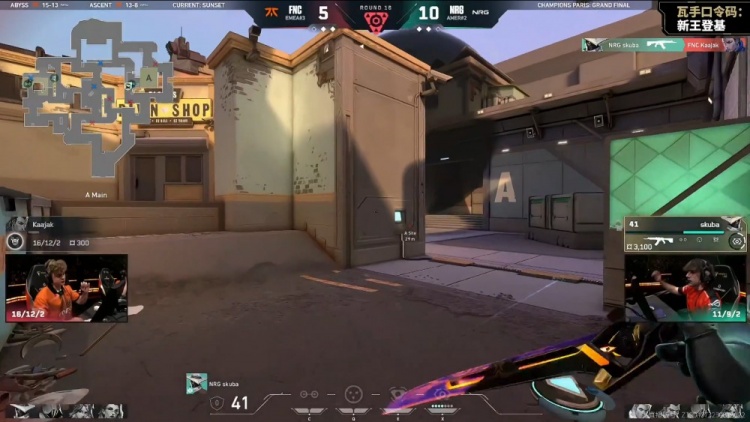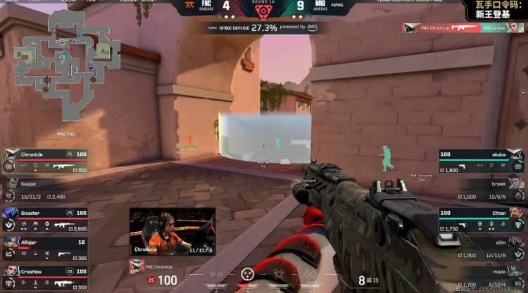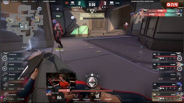 第18局,Alfajer中路先送首杀,FNC冲B下包,NRG五人回防,mada带走Kaajak,残局Crashies1v3被杀,NRG13-5战胜FNC。