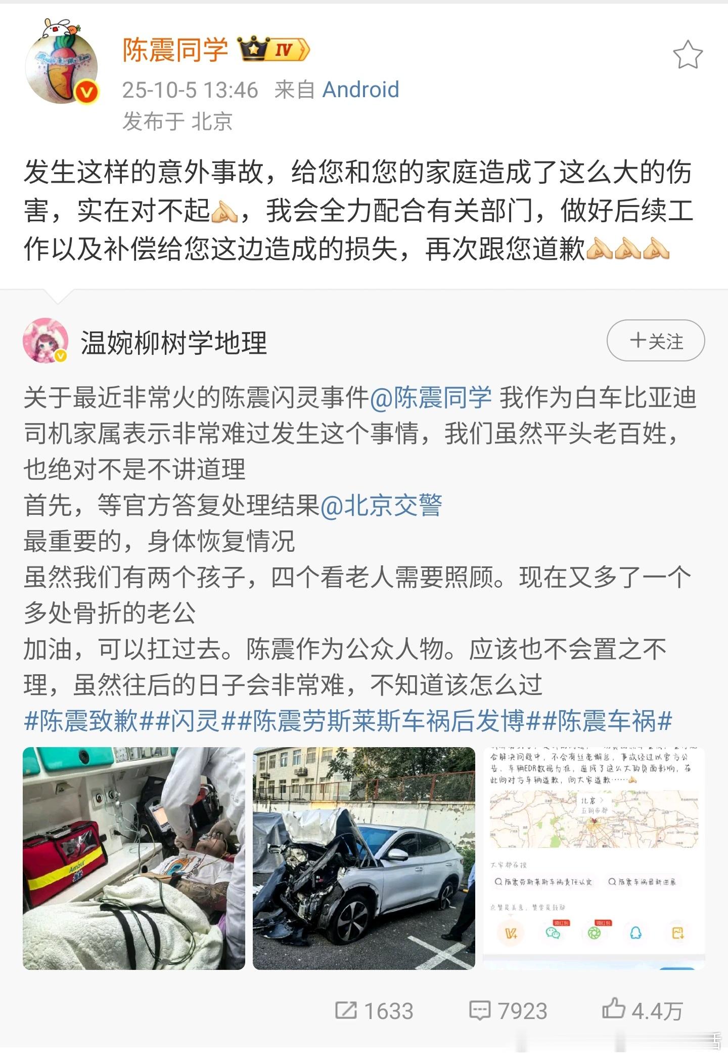 陈震车祸受伤司机家属发声陈震劳斯莱斯发生车祸 陈震再次道歉,并表示律师会全力配合