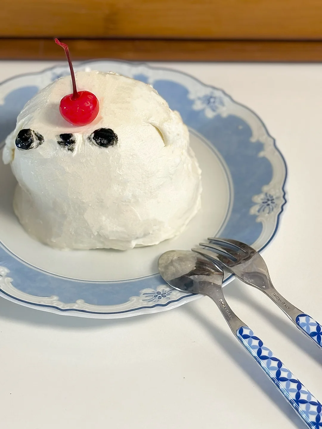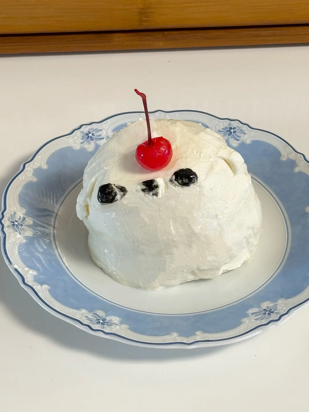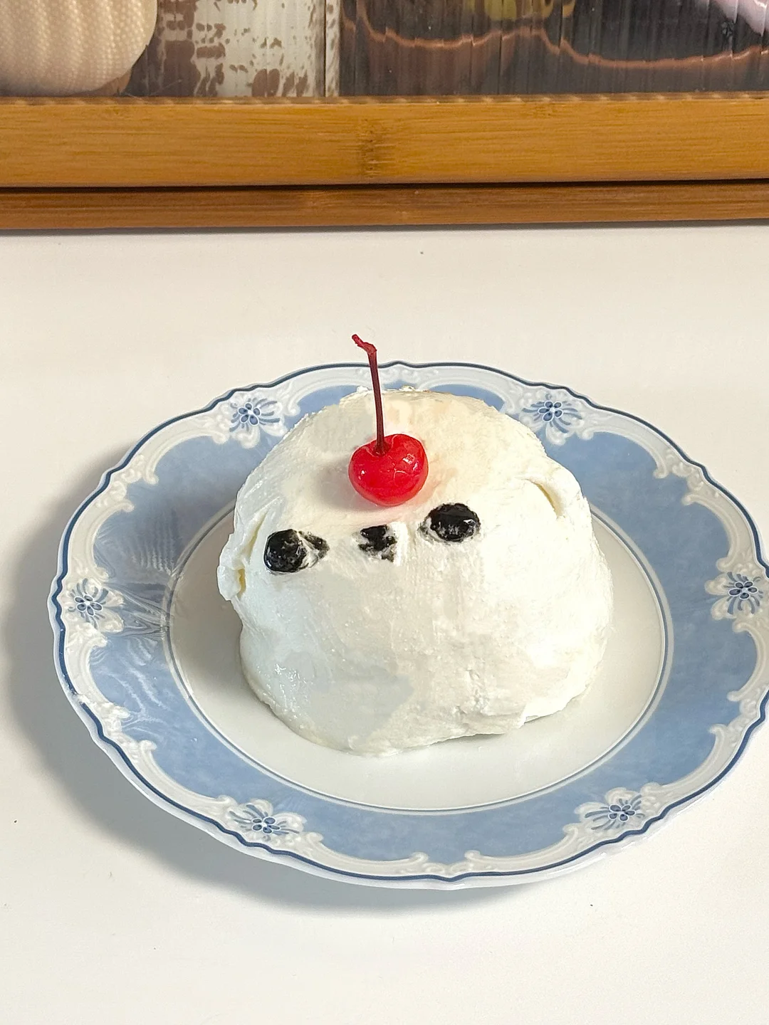 2.奶油加入厚酸奶与砂糖打发,冷藏好的蛋糕脱模去掉保鲜膜,外层均匀抹上酸奶奶油,再用芝麻酱画上表情