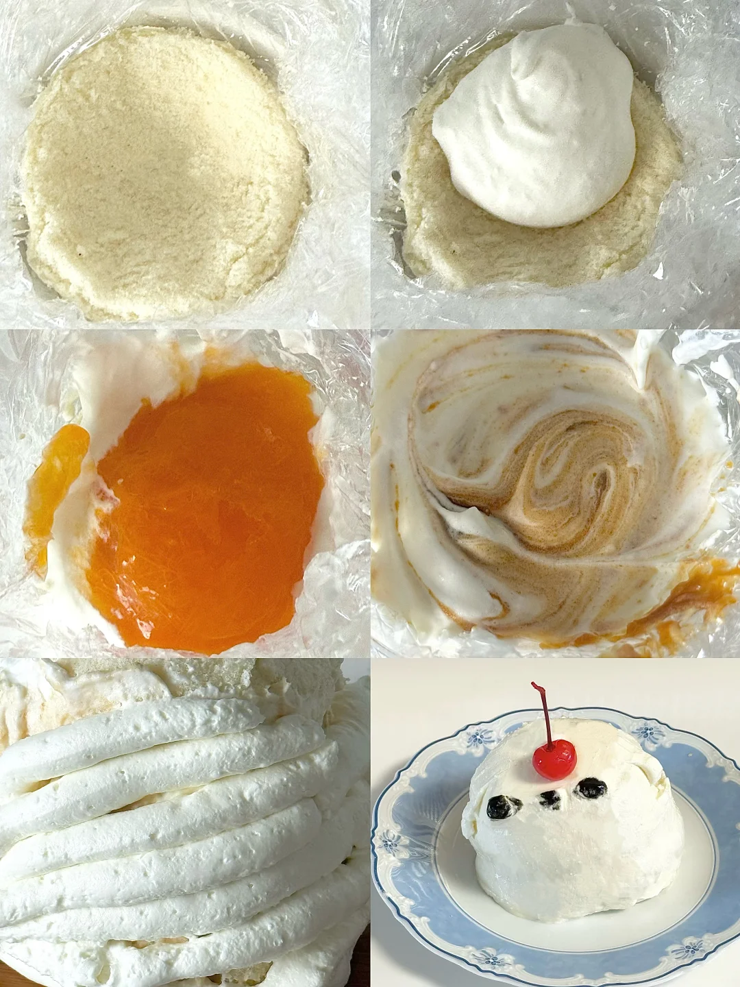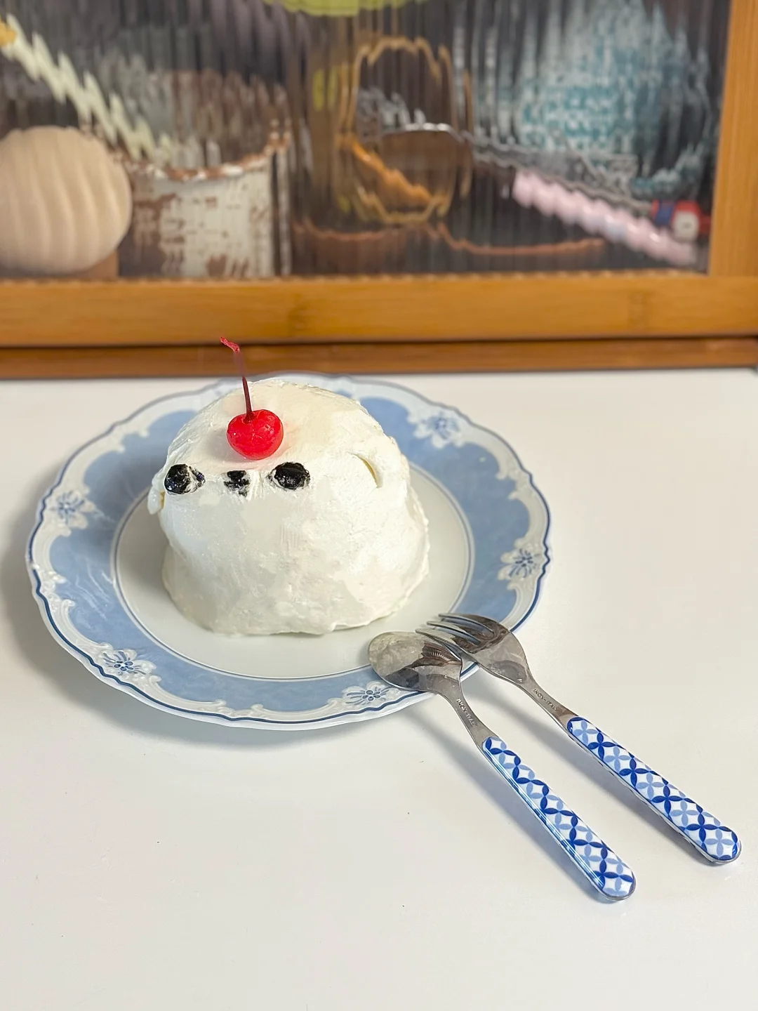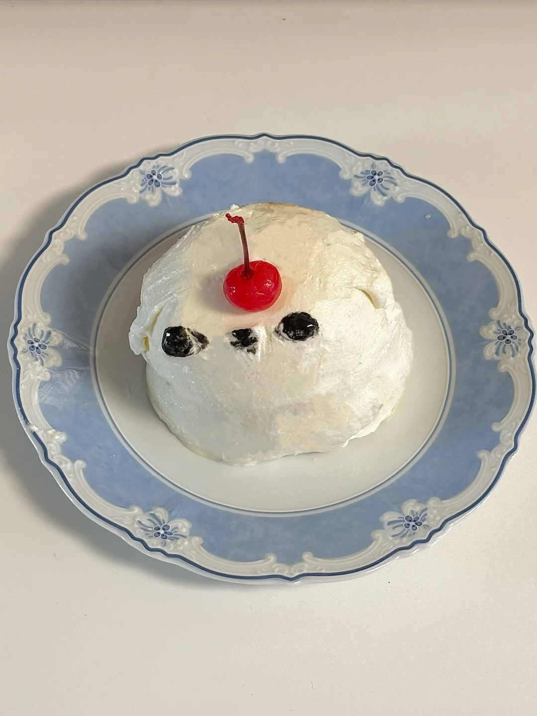 2.奶油加入厚酸奶与砂糖打发,冷藏好的蛋糕脱模去掉保鲜膜,外层均匀抹上酸奶奶油,再用芝麻酱画上表情