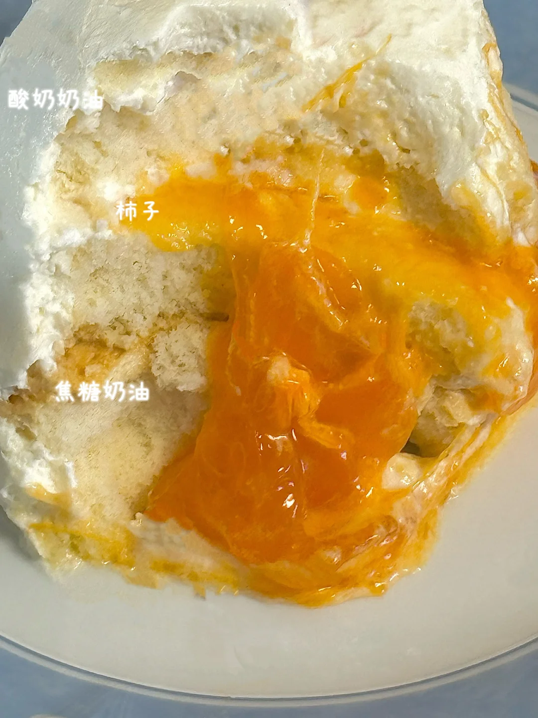 海绵蛋糕胚、柿子、焦糖酱、奶油、厚酸奶、芝麻酱、砂糖