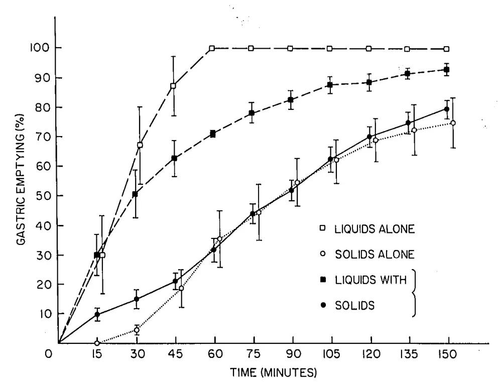 影像学研究发现,液体和固体在胃里的排空速度本就不同。液体通常以指数曲线方式迅速离开胃部,而固体则需要先被研磨到直径小于1毫米,才能一点点通过幽门进入小肠,因此排空速度更慢。
