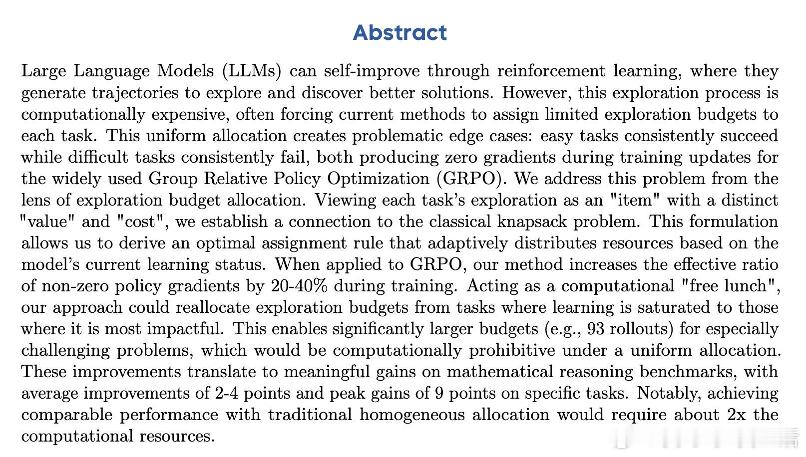大型语言模型(LLMs)通过强化学习(RL)自我提升,但探索阶段计算成本极高。传统均匀分配探索预算导致“简单任务过度探索,困难任务探索不足”,很多样本无法产生有效梯度,训练效率受限。