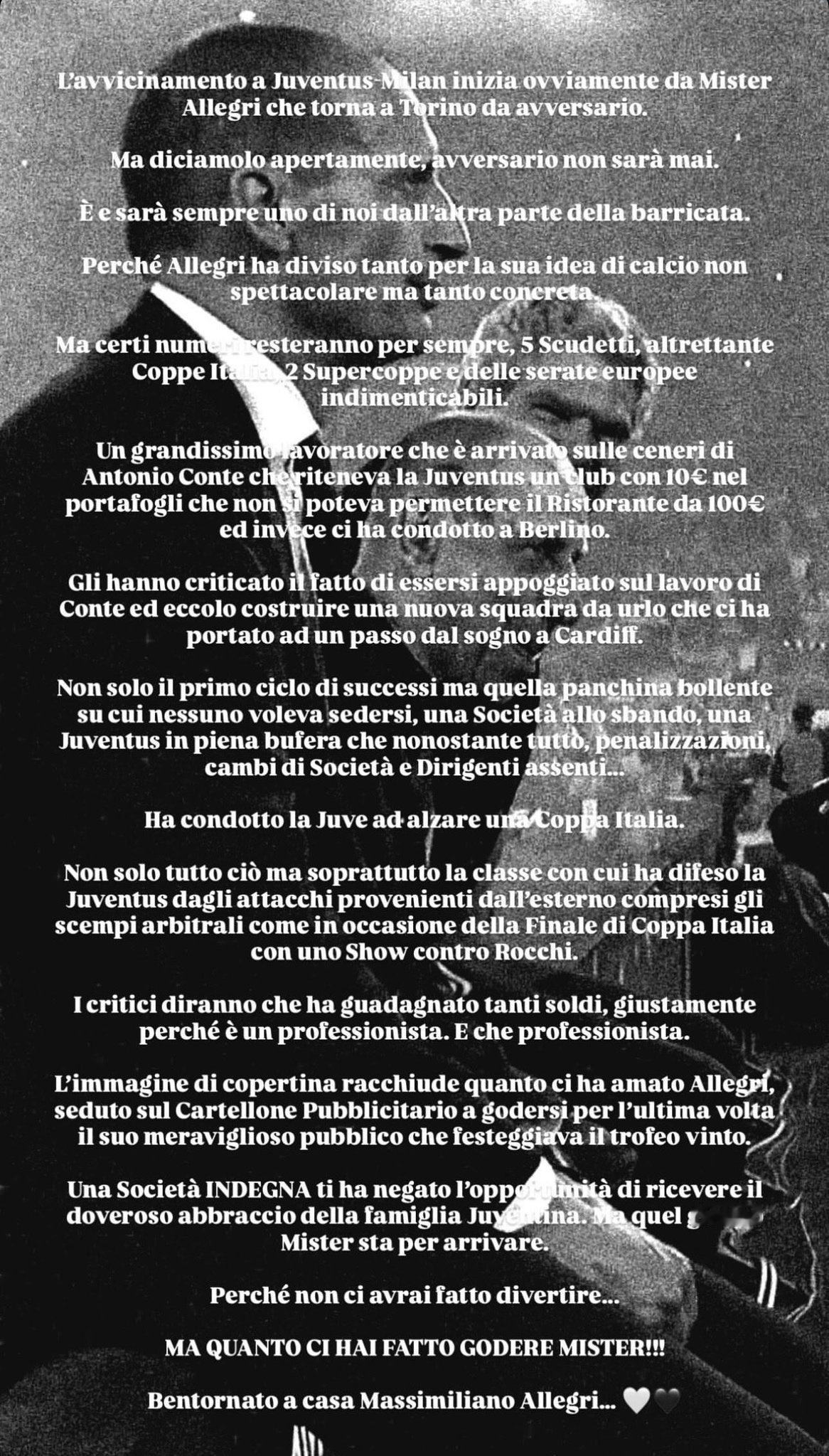 【这段话是否说出了你的心声?】尤文图斯南看台球迷组织长文寄语阿莱格里: “尤文图斯对阵AC米兰的比赛主角显然是阿莱格里先生,他以对手的身份重返都灵。但坦白说,他永远不会真正成为对手。他永远是我们中的一员,即使他现在身处另一边。 阿莱格里的足球理念引发了如此多的争议——并非总是惊艳,但始终扎实。某些数字已名垂青史:5个联赛冠军、5个意大利杯冠军、2个超级杯冠军,以及令人难忘的2次欧冠决赛之夜。 在孔蒂眼中,尤文图斯是一家口袋里只有10欧元的俱乐部,连100欧元的餐厅都负担不起。然而,阿莱格里却带领我们一路来到柏林。他曾因依赖孔蒂的班底而受到质疑,但他打造了一支全新的、强大的球队,带领我们距离在卡迪夫城的梦想仅一步之遥。 他不仅成就了尤文图斯的第一个辉煌,更在俱乐部一片混乱、身陷风暴的时期,毅然决然的选择来到了那个无人问津的“滚烫”教练席。尽管经历了种种磨难——处罚、管理层更迭——他仍然坚持了下来。 他带领尤文图斯再次捧起意大利杯。不仅如此,他还展现出非凡的领导力,抵御了外界的攻击,包括意大利杯决赛中的裁判丑闻以及与罗基的那场令人难忘的硬刚对决。 酸葡萄们会说他赚了很多钱——这理所当然,因为他是一名职业教练。而且,他真的是一位职业教练。 图片概括了阿莱格里对我们的爱,他坐在广告牌上,与他热情的球迷们一起庆祝夺冠,享受着他人生中的上一座奖杯。 一家不值得的俱乐部剥夺了他获得尤文图斯大家庭拥抱的机会。但这位“先生”回归的那一天很快就会到来。因为,即使您并不总是给我们带来欢乐…… 但实际是,先生,您给了我们太多欢乐!!! 欢迎回家,马西米利亚诺·阿莱格里……”