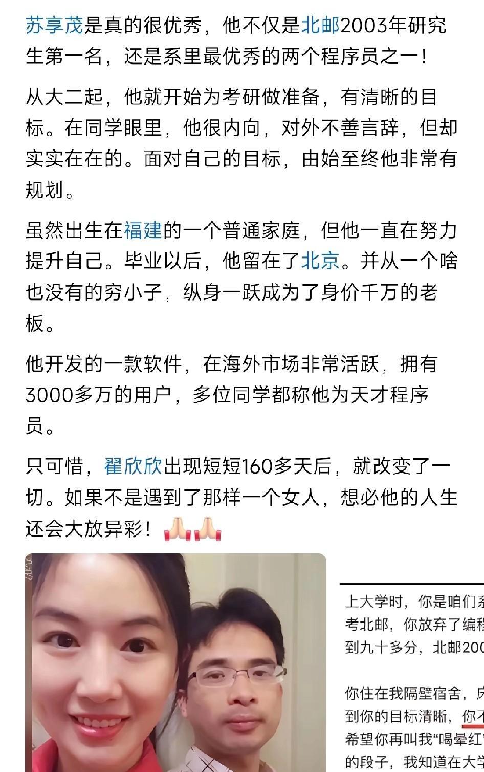 苏享茂的“优秀”,曾像一层精致的糖衣,裹住了世人对他的初始判断。我们看待事物,总难免困在表象的迷障里,所见不过冰山一角,难窥全貌。 最初听闻他被一个女人骗取所有,最终绝望跳楼,只觉翟欣欣心如蛇蝎,而苏享茂是彻头彻尾的可怜人——那样炽热地爱一个人,却落得倾家荡产、性命不保的结局,怎不令人唏嘘? 可当真相的碎片逐渐拼凑完整,那点怜悯便如潮水退去。原来“可怜之人必有可恨之处”从不是妄言,他的结局里,藏着自己种下的因。所谓无辜,在层层剖开的现实面前,早已站不住脚。 一个人纵有万千光环,若丢了良知,被色欲蒙了眼,便如精密仪器失了校准,再难辨是非曲直。 苏享茂便是如此。他推开了那个与他同居多年的女子——那个什么都不要,陪他从泥泞里蹚过来的人。待他功成名就,钱包鼓胀,便觉得自己“配得上更好的”,将目光投向了所谓的“美女”。真爱他的人,被他剥夺得一无所有。她曾把青春碾碎了,掺进他无名无姓的日子里,陪他熬过没有光环的时光。可他上岸第一剑,先斩的便是意中人。这得志便猖狂的姿态,藏着骨子里的卑怯,算不得真正的强大。 要他命的女人,他偏要奉上全部。这般“优秀”,不过是浮在水面的泡沫,内里从未生长出智慧的根。中国太多男人,眼睛只盯着表象——外在的成功、机敏与财富,却始终跨不过那道通往智慧的坎。自身灵魂的缺口,总要靠外界的色相来填补,于是便只能在美色里沉沦,成了欲望的囚徒。 没有内核的聪明,终究是小聪明。能被色相迷惑的,从来不是他人的手段,而是自己内在的空洞。就像没有根基的建筑,再华丽,一阵风来,便塌了。 #苏亨茂# #人品决定成败,你认同吗#