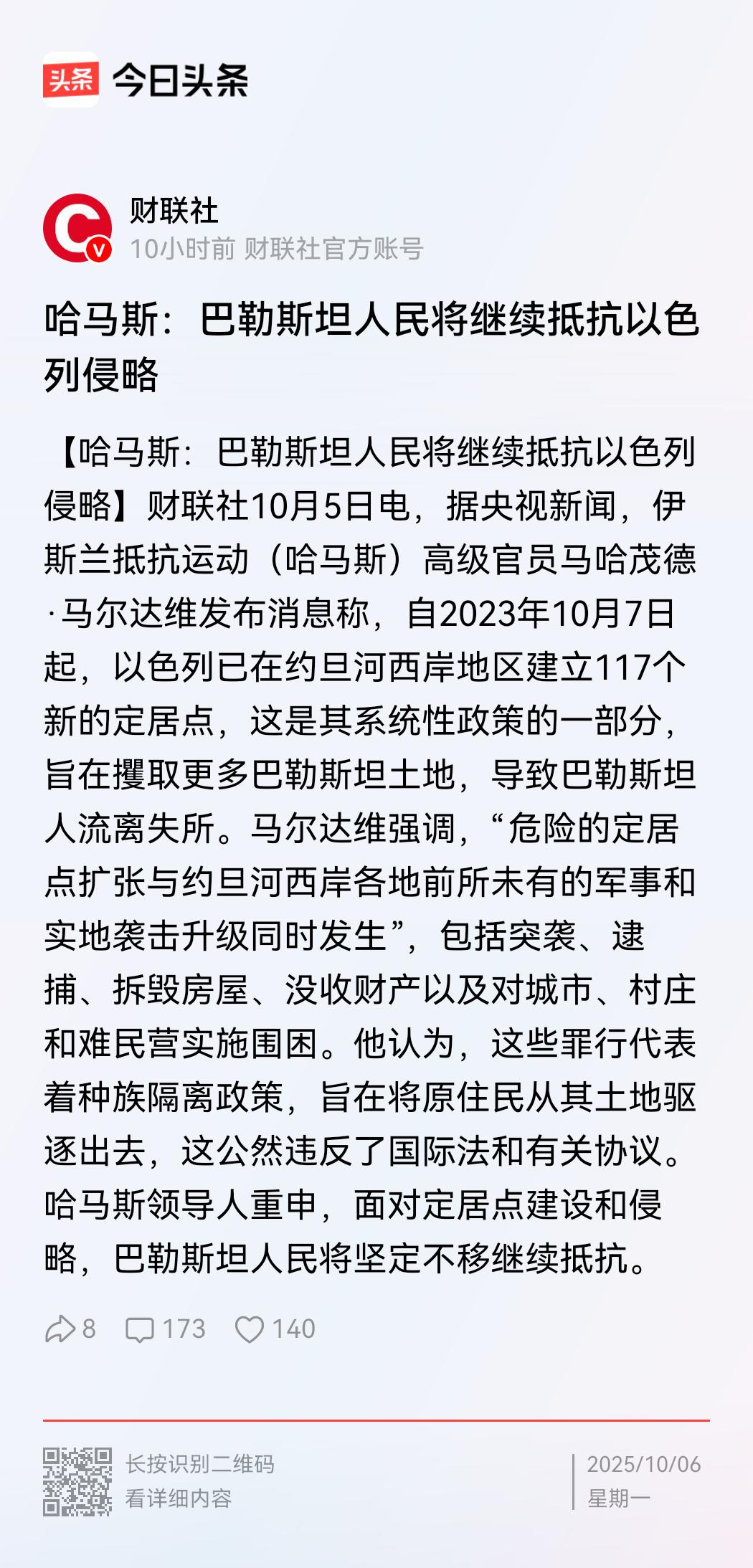 就在刚刚,哈马斯宣布了:不跪! 根据财联社10月5日报道,哈马斯高级官员马哈茂德·马尔达维毫不动摇发言说道:“面对定居点建设和侵略,巴勒斯坦人民将坚定不移继续抵抗!” 所谓定居点,乃是以色列在巴勒斯坦领土约旦河西岸建立的殖民点,往往都是先派以色列的普通民众过去,打着定居的口号,占据巴勒斯坦的领土,故意与巴勒斯坦普通民众发生冲突;冲突发生之后,以色列人就会叫来以色列的军队,以发生冲突为借口,强行将当地的巴勒斯坦人驱逐,从而达到蚕食领土的目的。 以色列已经这样做了很久,蚕食了很多巴勒斯坦的土地。 甚至,他们还会故意毁坏巴勒斯坦的农田,甚至填平当地的水井,断掉当地的水源,从而逼迫巴勒斯坦人远离。 这样的定居点,毫无疑问,本质上就是一种残酷的殖民。 现在,马哈茂德·马尔达维则是宣布,面对这样的行为,巴勒斯坦人将继续坚决抵抗,绝不屈服。 前不久,特朗普放出二十点协议,称这是哈马斯的最后一次机会;10月3日,哈马斯对这个二十点协议做出回应,表示原则上同意,愿意按照协议要求,释放人质,将加沙地区的管理权移交给一个中立的官僚机构。 对于这个回应,大部分人的解读,都是认为哈马斯这是彻底服软了,已经事实上的投降,以色列这方赢得了最终的胜利。 可是,哈马斯高级官员马哈茂德·马尔达维的最新发言则是表明,哈马斯并没有彻底服软,他们依旧一如既往,还是会坚定抵抗,还是不跪! 显而易见,若是以色列真以为从此之后,就高枕无忧,可以肆无忌惮的欺压巴勒斯坦民众,侵占巴勒斯坦土地,那它就打错算盘了,如果不改变自己的残忍作风,巴勒斯坦人民的抵抗将永不会停止。