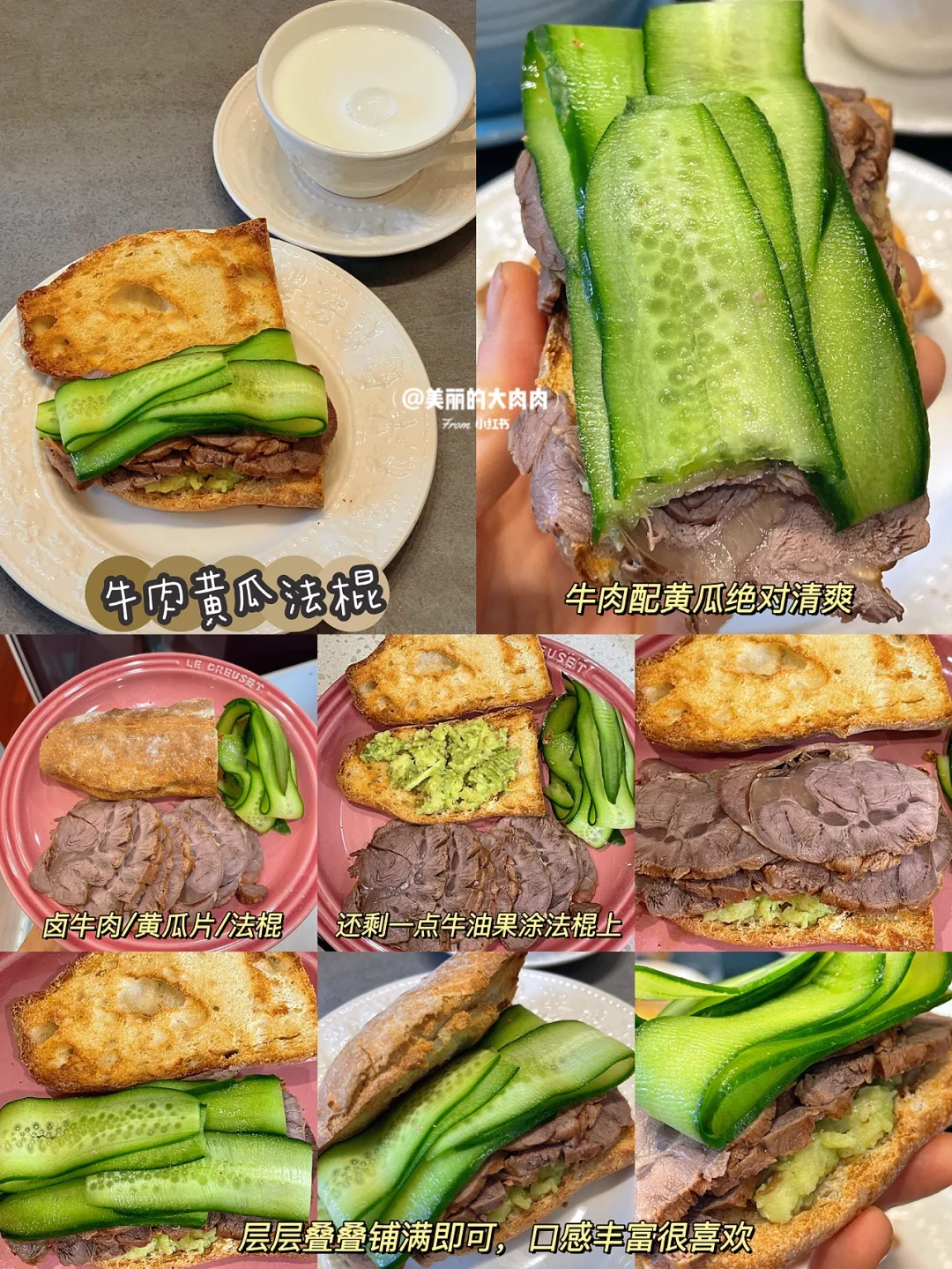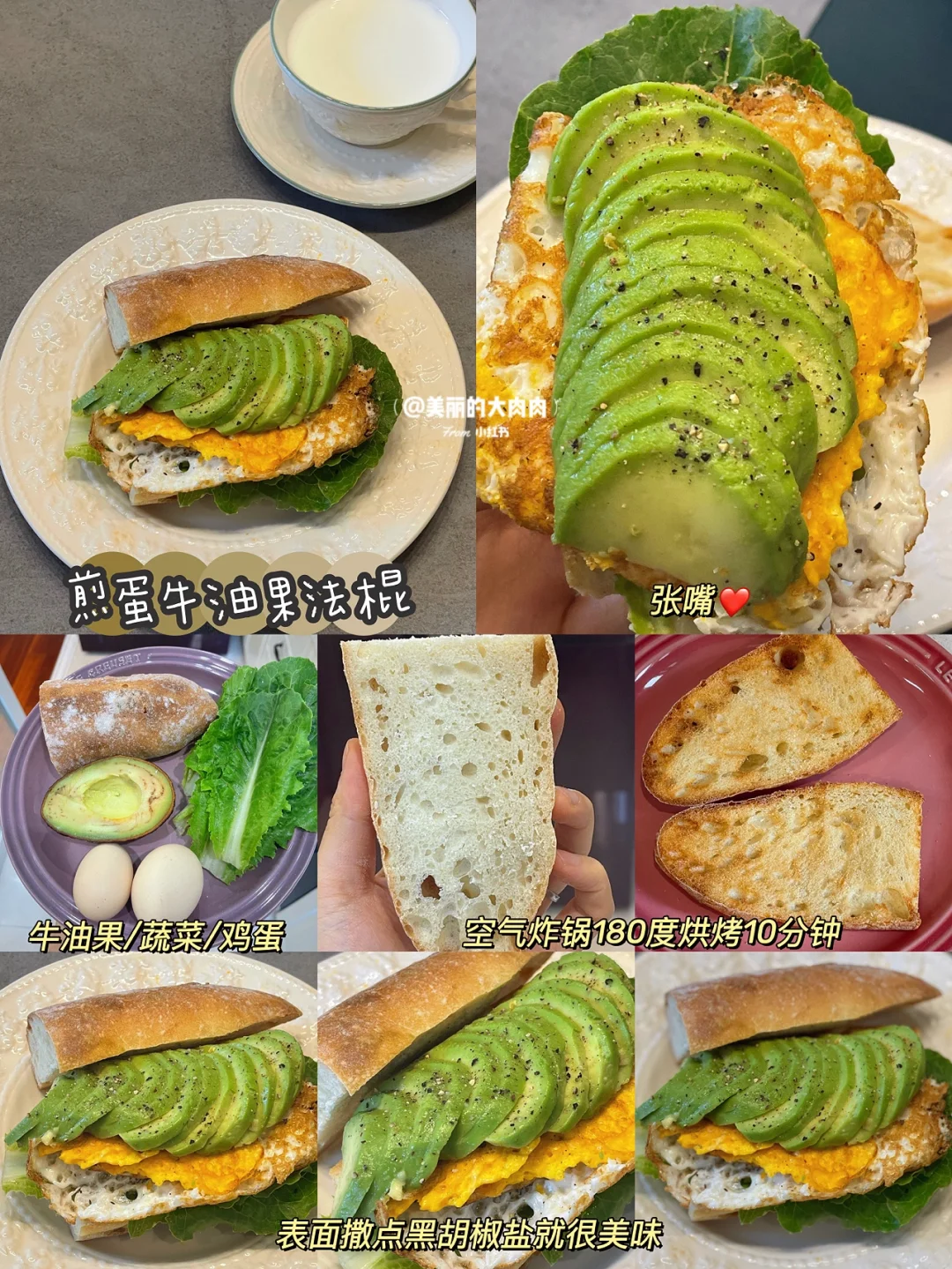 从此subway是路人! 身高:172cm 体重:65kg-53kg 体脂:28%-18% ———- 贝果吃腻了,我们来挑战一周法棍三明治不重样吧! 周末给自己安排了一波法棍🥖无糖无油配料炒干净 这周的早餐主食就被法棍承包了! ❤️为姐妹们推荐几款我的最爱 1⃣️牛油果鸡蛋酱法棍三明治 所需食材:牛油果🥑、鸡蛋🥚、法棍🥖、胡椒盐 做法:法棍空气炸锅180度10分钟烤焦脆、鸡蛋煮熟加牛油果搅散加黑胡椒盐搅匀涂抹在法棍上即可! 👉🏼推荐理由:法棍酥脆牛油果鸡蛋酱绵密,这复杂的口感太幸福了! 2⃣️金枪鱼泥法棍三明治 所需材料:水浸金枪鱼罐头🥫、酸黄瓜🥒、无糖酸奶、法棍🥖、胡椒盐 做法:金枪鱼捞出干的部分,把水捏掉,加所有食材混合涂抹在面包上即可 👉🏼推荐理由:subway我最爱的金枪鱼泥三明治,可惜热量着实有点高,自己用无糖酸奶代替就超美味!加点洋葱碎更香可是怕嘴巴臭就算啦! 3⃣️牛肉黄瓜三明治🥖 所需材料:卤牛肉、黄瓜片、法棍 做法:牛肉切薄片一层层盖法棍上即可 👉🏼推荐理由:自己做的卤牛肉配黄瓜,早餐或者晚餐吃都满足又安心!高蛋白高膳食纤维,这样的一餐太完美👏🏼 4⃣️牛油果煎蛋三明治🥖 材料:鸡蛋🥚、牛油果🥑、法棍 做法:鸡蛋煎熟➕牛油果片一层一层盖上去即可 👉🏼推荐理由:只是看着就很幸福,别说吃着有多满足了! 🌟法棍减脂期也是非常适合做主食的!自己做的不添加皇后糖等吃着更安心、饱腹感特别强不说口感也很酥脆!姐妹们都快去试试吧! 好好吃饭/好好运动/好好爱自己 ㊗️姐妹们早日和马甲线相遇