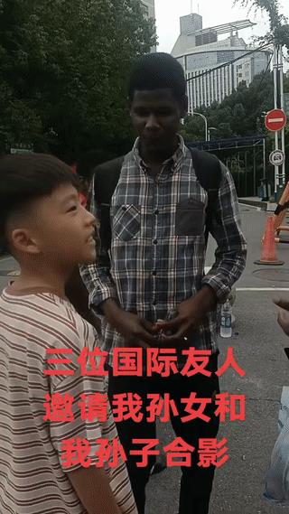 爷爷带着孙子孙女在街头偶遇三名国际友人? 他们还热情的邀请孩子们一起合影留念。