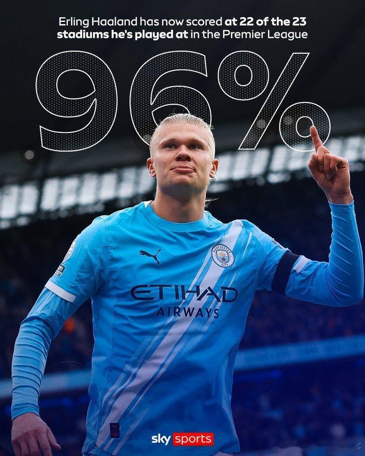 💥哈兰德已经在英超出战的23座球场中攻破了22座的球门!