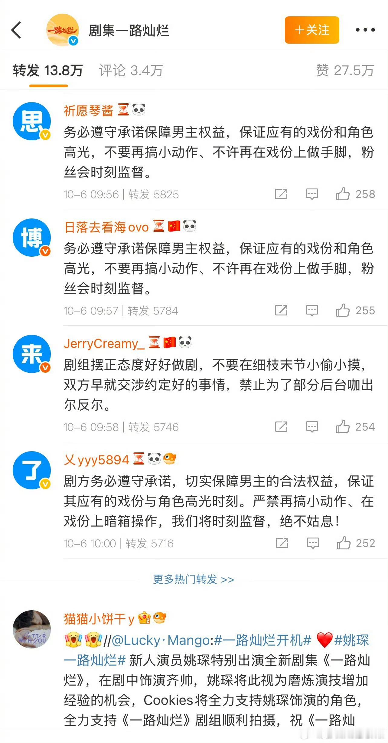 我去田嘉瑞粉丝把姚琛的《一路灿烂》官宣博冲了甚至还排了字
