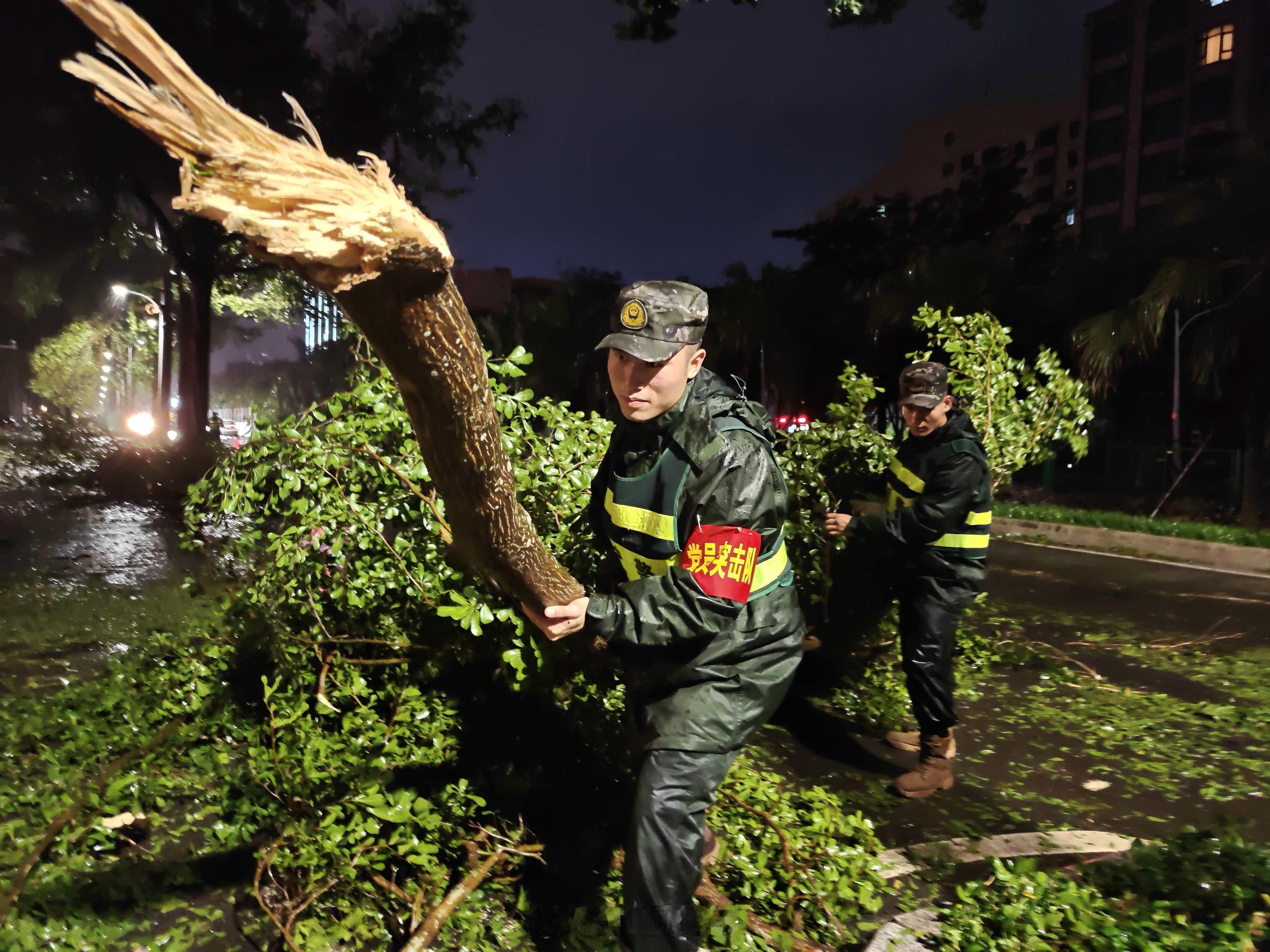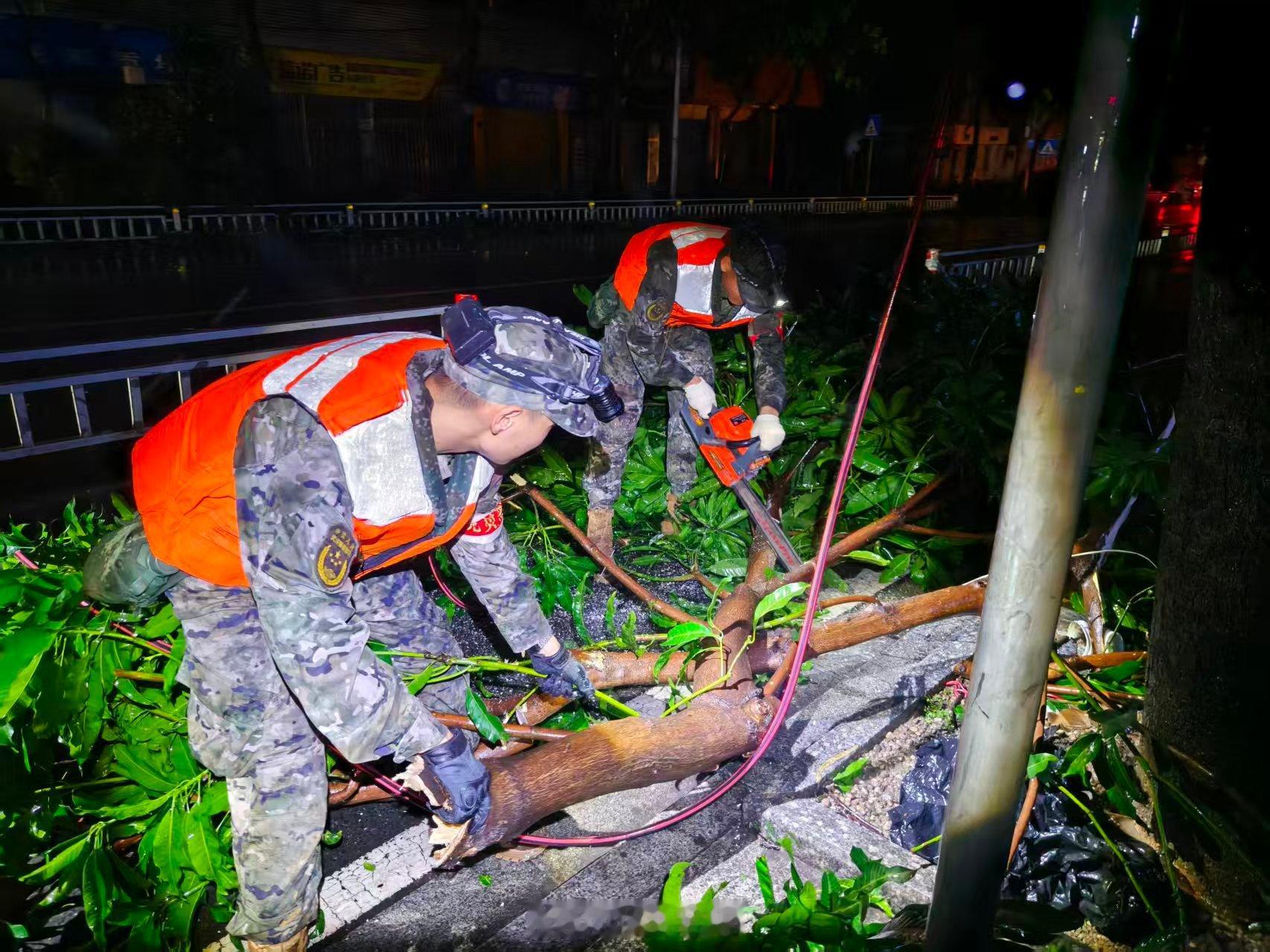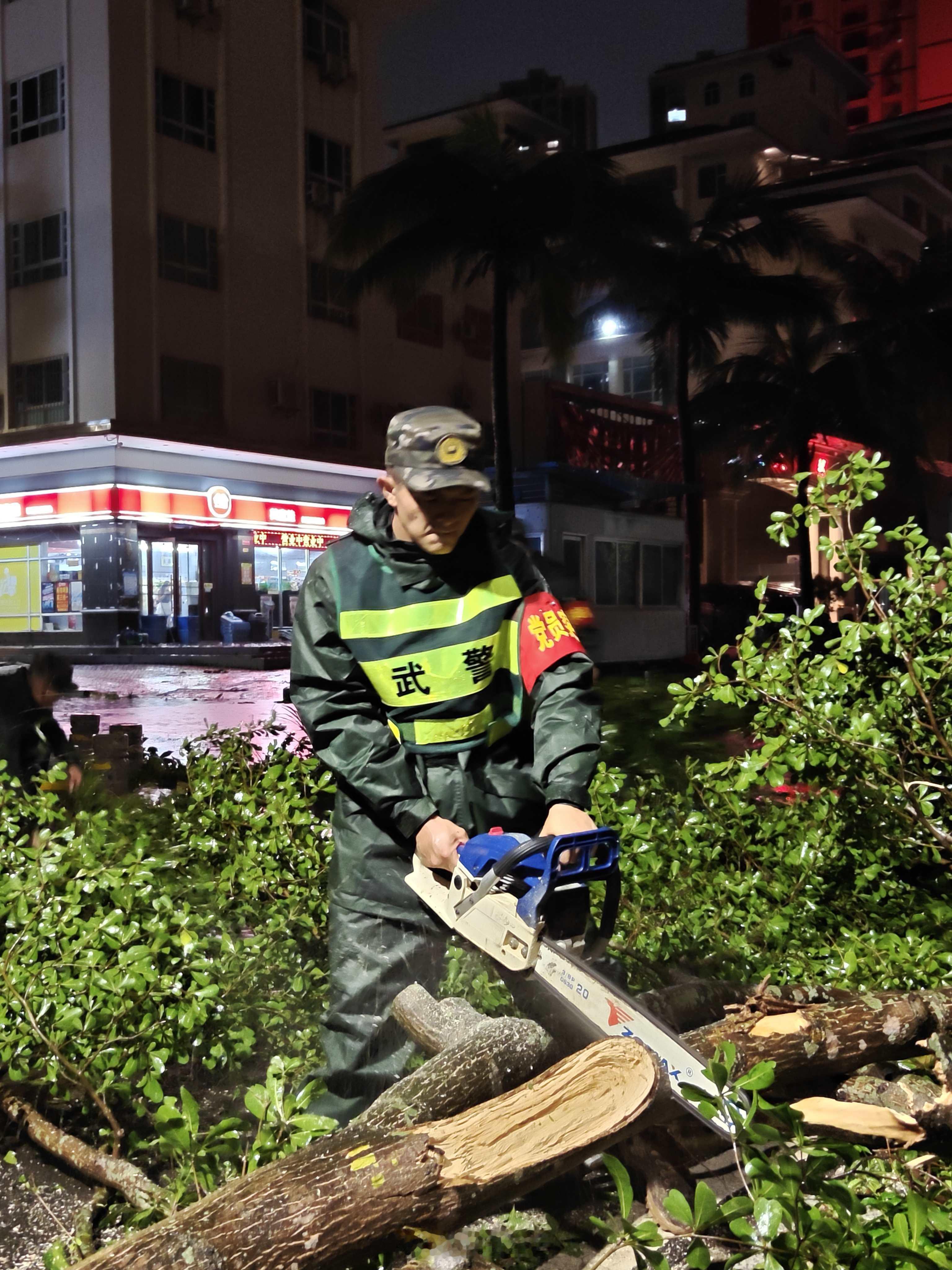 【台风“麦德姆”过境,武警官兵紧急出动投入救援】今年第21号台风“麦德姆”于10月5日14时50分左右在广东徐闻东部沿海登陆,中心最大风力达14级,引发粤西多地强降水。武警广东总队湛江支队紧急出动100名兵力,携带油锯、镐头、铁铲等抢险物资连夜投入救援,全力保障人民群众生命财产安全。(陈晓杰 廖彬华 顾远)