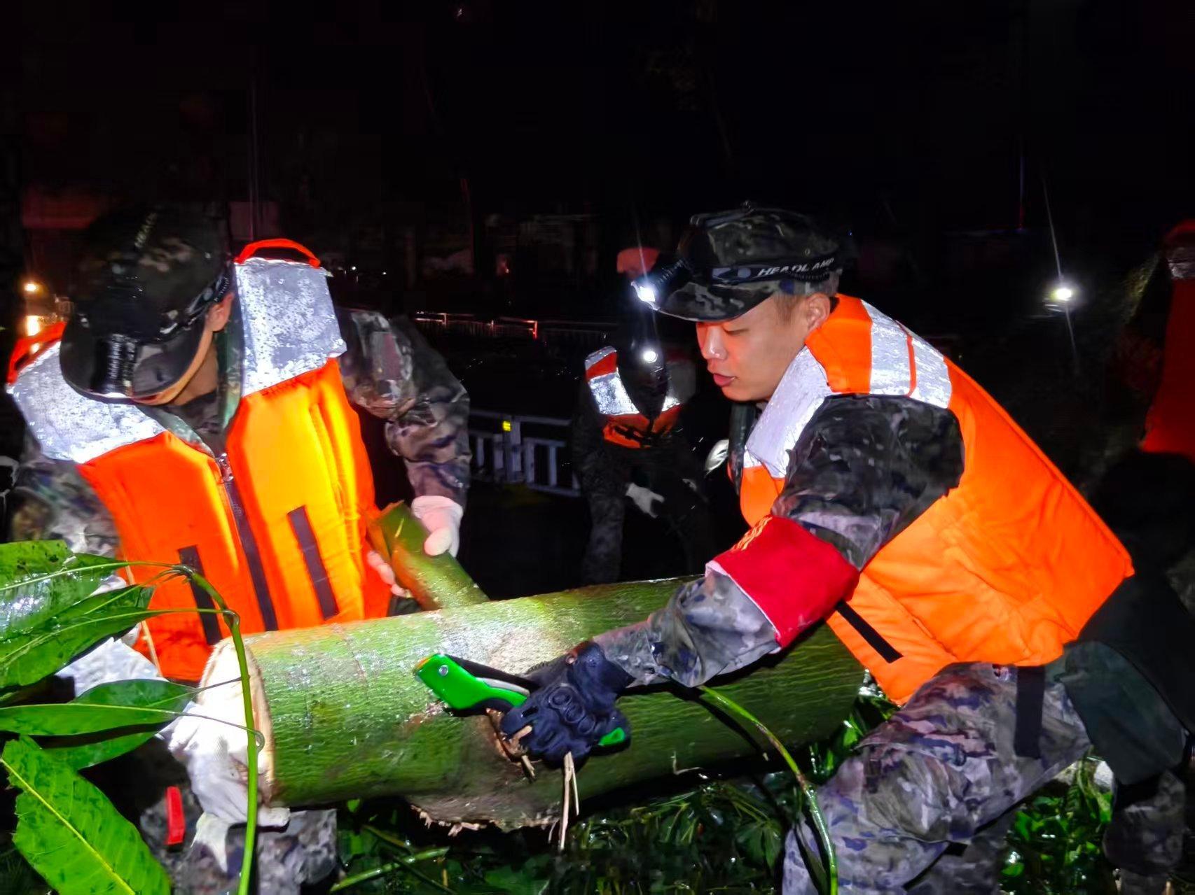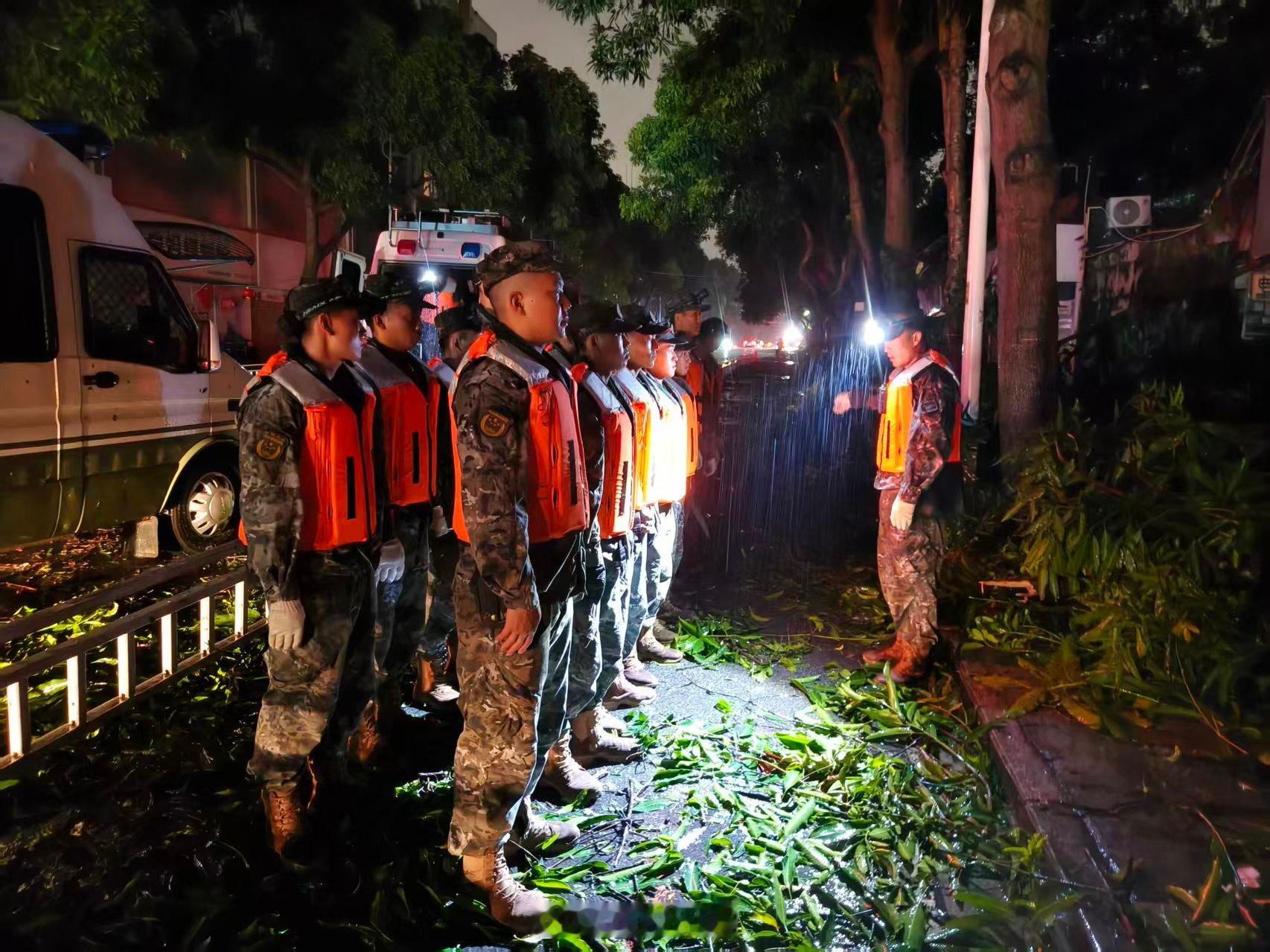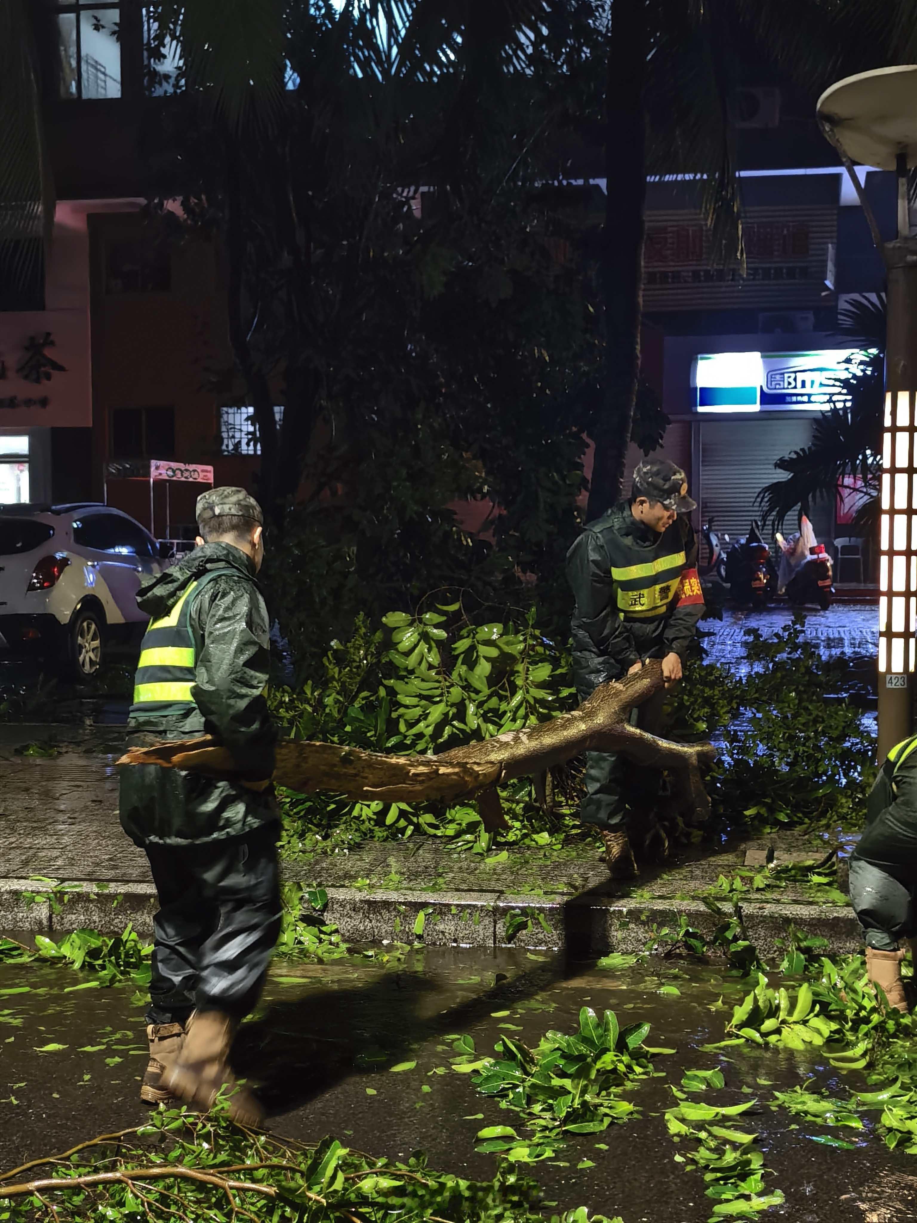 【台风“麦德姆”过境,武警官兵紧急出动投入救援】今年第21号台风“麦德姆”于10月5日14时50分左右在广东徐闻东部沿海登陆,中心最大风力达14级,引发粤西多地强降水。武警广东总队湛江支队紧急出动100名兵力,携带油锯、镐头、铁铲等抢险物资连夜投入救援,全力保障人民群众生命财产安全。(陈晓杰 廖彬华 顾远)