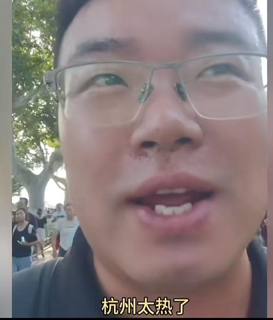 杭州的天把小伙热懵了,满头大汗!小伙说,老家20多度,舒服死了,国庆假期儿子想去