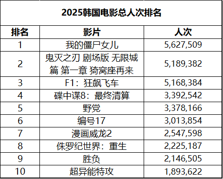 3.《鬼灭之刃 剧场版 无限城篇 第一章 猗窝座再来》累计人次518万超越《F1》排名年度第2。