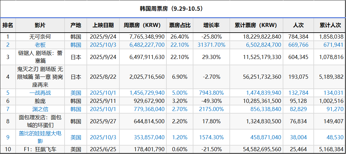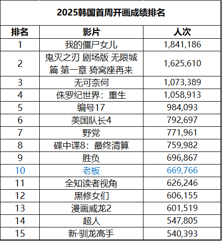 2. 韩国动作喜剧《老板》开画成绩不错;