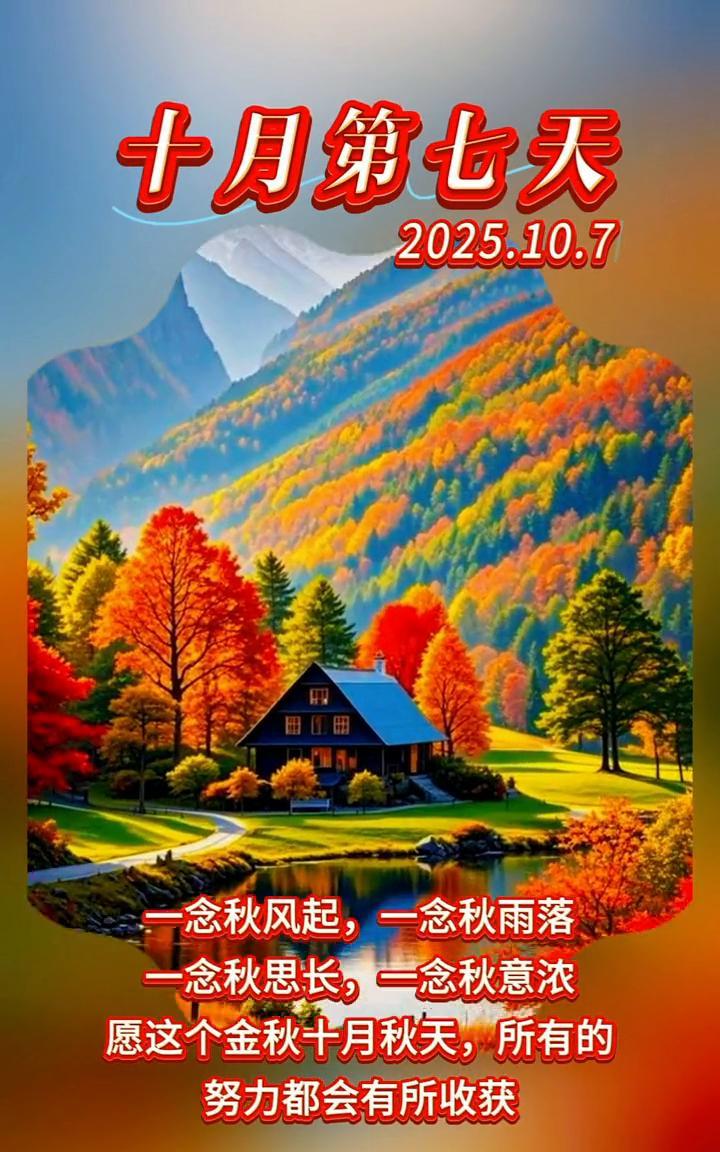十月第七天,2025.10.7。 一念秋风起,一念秋雨落。一念秋思长,一念秋意浓。愿这个金秋十月秋天,所有的努力都会有所收获。