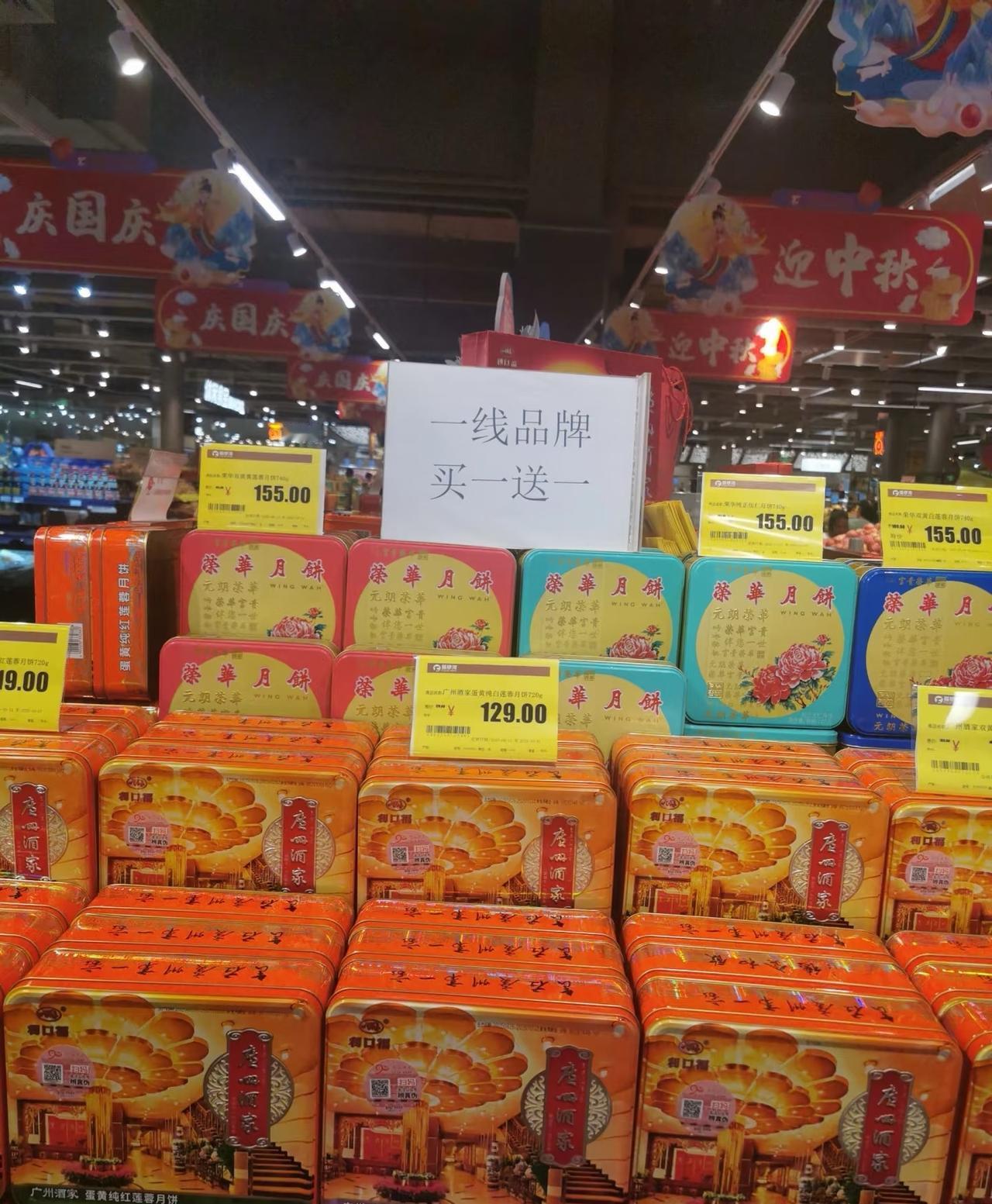 月饼五折啦!! 刚才在天环买了两盒美心,全场买一送一,不能选一样的,要选一盒差不多价的,冰皮也可以选,越是打折越厉害的品牌,以后会越来越不好卖,都知道会打折厉害。