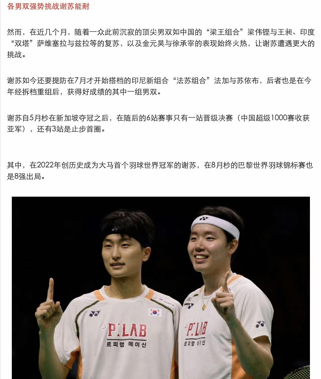【坚持搭档至2028奥运 谢苏不离不弃】 谢苏虽然目前正在经历战绩下滑,但谢定峰表示,他和苏伟译有坚定的信念,从不考虑效仿徐金和双菲那样拆档重新出发。 谢定峰表示,他与苏伟译自2017年开始搭档迄今所建立的默契和信任会经得起时间的考验,他们会继续为争得梦寐以求的奥运金牌而奋斗。 “可以肯定的是,伟译和我会坚定的并肩作战至2028年,我们的梦想是在洛杉矶奥运会上再次登上领奖台。此外,明年在日本名古屋举行的亚运会也是我们的关键目标,我们希望每年至少能拿下一座冠军,直到洛杉矶奥运会的展开。”“当然,如果在每一年都能夺得多个冠军,那就是额外的收获。” 谢苏表示会努力研究徐金组合打法,谢定峰,“竞争极其激烈,所以对我们来说,最重要的是保持稳定的表现。金元昊和徐承宰现在的状态确实非常出色,但我相信其他组合很快也会研究他们的打法,我们也会通过观看比赛录像,与教练一起分析他们的弱点。”#秋日生活打卡季#