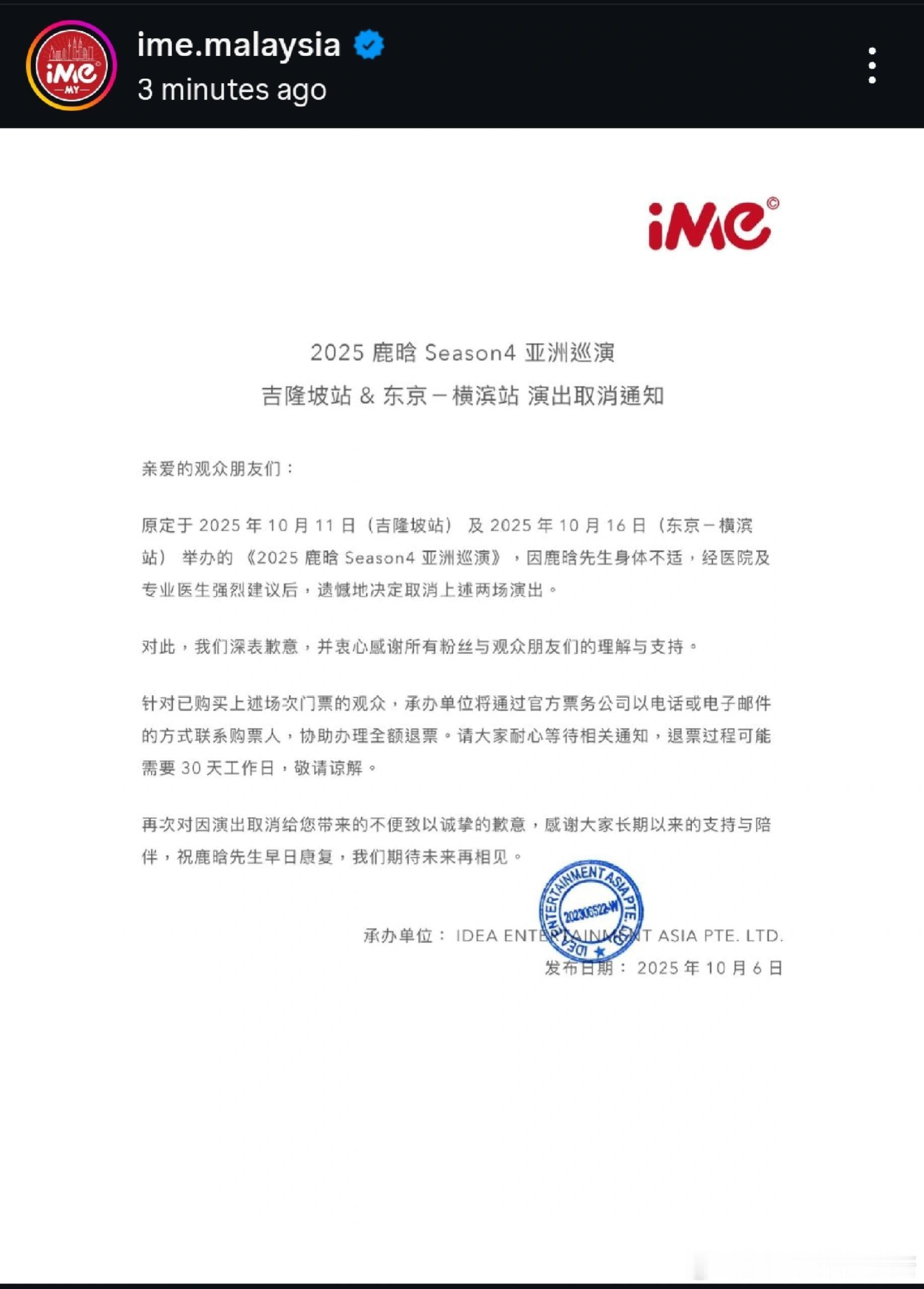 鹿晗四巡吉隆坡站、横滨站取消了🇲🇾🥲,因为鹿晗的腿伤又严重了,医生强烈建议